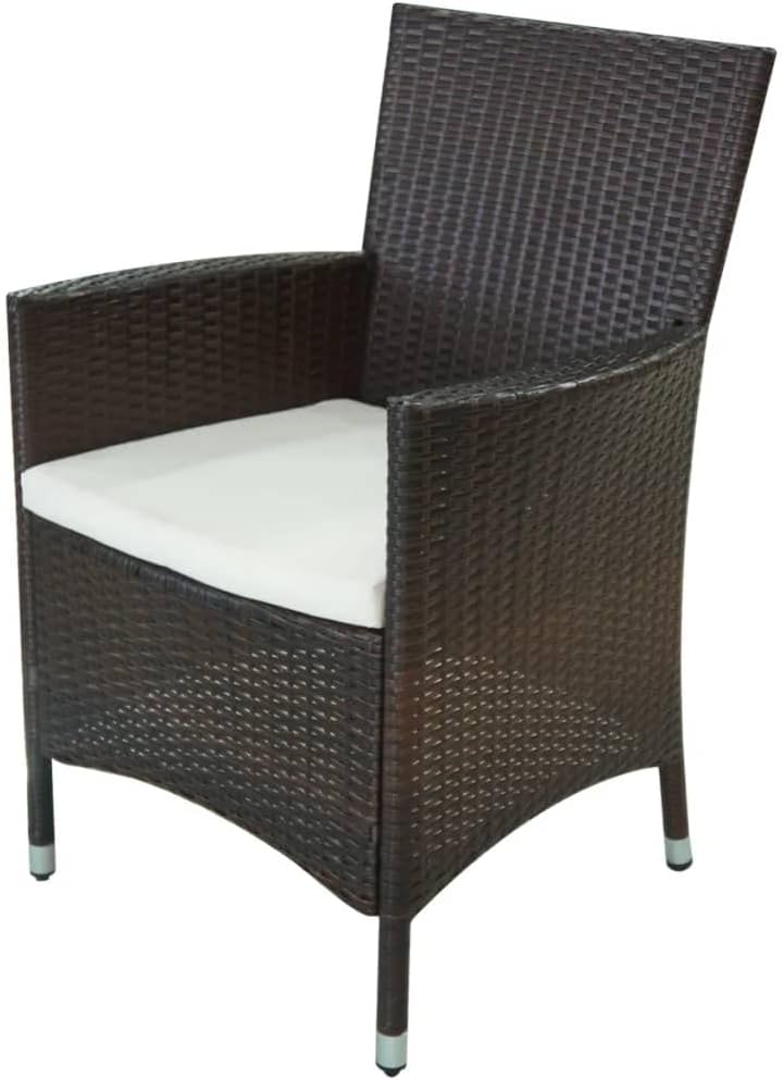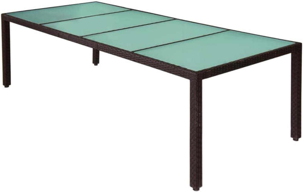 Our stylish rattan patio furniture set will become the focal point of your garden or patio! This dining set, with an elegant design, will be a great choice for al fresco dining or relaxing in the garden.The powder-coated steel frames make the table and chairs strong and sturdy, and thanks to their lightweight construction, all items are easy to move. Made of weather-resistant, waterproof PE rattan, the dining set is easy to clean. The glass top is also easy to clean with a damp cloth.The thick, soft, foam-filled seat cushions are highly comfortable and made of water-repellent polyester. The removable and washable covers are equipped with zips.Delivery includes 1 table, 10 chairs and 10 cushions.Note 1): We recommend covering the set in the rain, snow and frost.Note 2): This item will be shipped flat packed. Assembly is required; all tools, hardware and instructions are included.Rattan color: BrownCushion color: Cream whiteMaterial: Powder-coated steel frame + PE rattan + glass tabletopCushion cover material: 100% polyesterCushion thickness: 2"Table dimensions: 98.4" x 39.4" x 29.1" (L x W x H)Chair dimensions: 23.2" x 23.6" x 34.6" (W x D x H)Seat width: 18.5"Seat depth: 17.7"Seat height from the ground: 17.3"Armrest height from the ground: 26.4"Delivery includes:1 x Table10 x Chair10 x Seat cushion