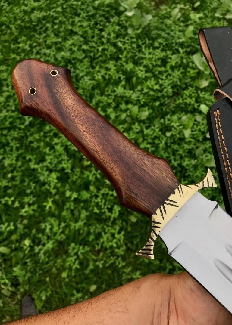 We Also Accept Custom OR Bulk Quantity Orders. Specifications Handmade J2 Steel Hunting Sword With Leather Sheath By Empire Industry. HANDLE MATERIAL AWESOME Rose Wood With Brass Guard. Overall Length: 26.00 Inches Blade Length: 20.00 Inches Handle Length: 6.00 Inches Blade Thickness: 5 - 6 mm J2 Steel Blade Having Sharp Edges. Hardness Of The Blade Is 57-60 HRC. SHEATH Well Hand Stitched Cow Hide Leather Sheath QUALITYSTANDARDS Our Damascus blades are made from high quality non-stainless steels which rival or exceed any Damascus blade made from the 10 series with 15N20.Our Damascus combination has taken years to perfect and has been tested under a variety of application which will offer professional performance in categories of toughness, strength (lateral stress) and edge honing and holding ability. And No two blades are exactly same because of its unique pattern. In a 5 spot Rockwell test our blades will average near or close to 58 which offers a perfect balances between its toughness and strength. Our blades due to carbon content need to be regularly treated with wax and/or 3 in 1 oil to maintain its superior quality. Questions If you have any question feel free to send us message we aim to answer all questions within 12 hours. Feedback If you are not satisfied with our service please contact us before leaving any negative or natural feedback. We will resolve all issues as quickly as possible. Disclaimer We are not responsible for any injuries associated with the use of our tools. Our products are intended for legal use only by responsible buyers. Therefore, we will not sell our products to anyone under the age of 18.
