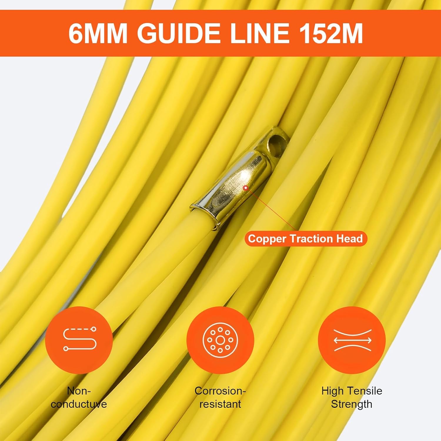 Why Choose Our High Performance Wire Cable?Engineered for demanding electrical work, this professional-grade fish tape delivers superior strength and flexibility for routing wires through complex conduit systems. Its temperature-resistant construction maintains performance in extreme conditions.Key Features:High Performance - Designed for maximum strength and flexibility, gliding smoothly through tight pipes with precise length controlPremium Specifications - 6mm (1/4") diameter epoxy fiberglass cable extends 152m (500'), withstanding -40°C to 80°C temperatures and 130° bendsSturdy Hand Carrier - Welded aluminum frame with triangular support and non-slip round pipe gripExtended Durability - Rust-proof fiberglass core with aluminum cage and high-grade axle for lasting tension strengthVersatile Applications - Ideal for telecom, electrical wiring, utility, construction, power grids and petrochemical installationsWhy It's Essential:Simplifies challenging threading jobs in intricate pipe systemsMaintains reliability in extreme temperature working environmentsProvides secure handling and control during high-tension operationsResists corrosion for long-term use in demanding conditionsAdapts to multiple industrial applications across various sectorsIdeal for professional electricians and utility technicians, this heavy-duty fish tape combines rugged construction with precision engineering to tackle the most demanding wire pulling tasks while enduring harsh job site conditions.