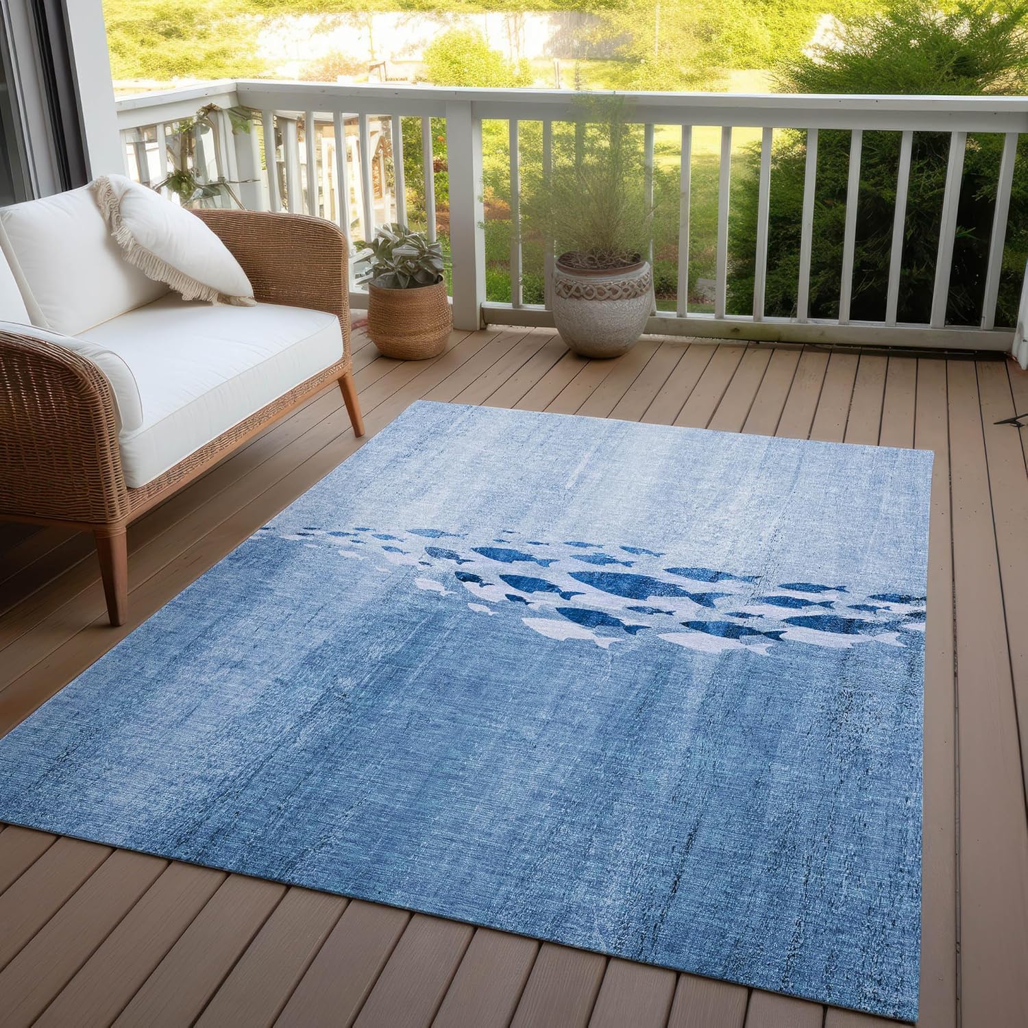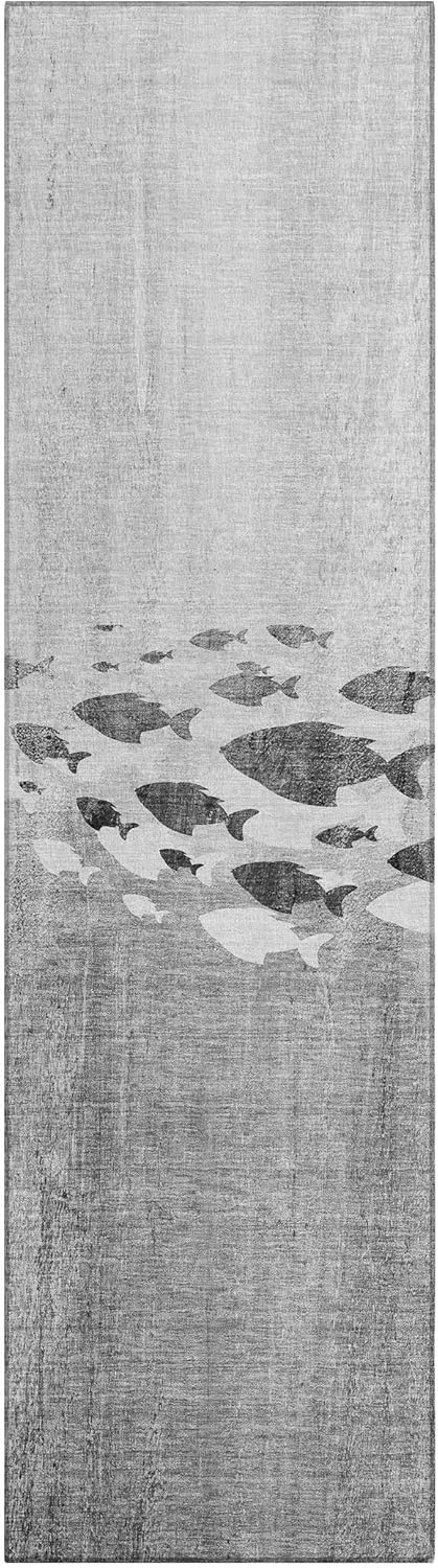Bring the tranquility of the ocean into your home with our transitional area rug, adorned with a school of fish against a soothing gradient ombre backdrop. This rug seamlessly marries nautical charm with modern design. Built for longevity, it's UV-stabilized for both indoor and outdoor use. The ultra-thin design includes a non-skid backing, saving you from purchasing an additional rug pad. Furthermore, it's machine-washable and an excellent choice for homes with children and pets.