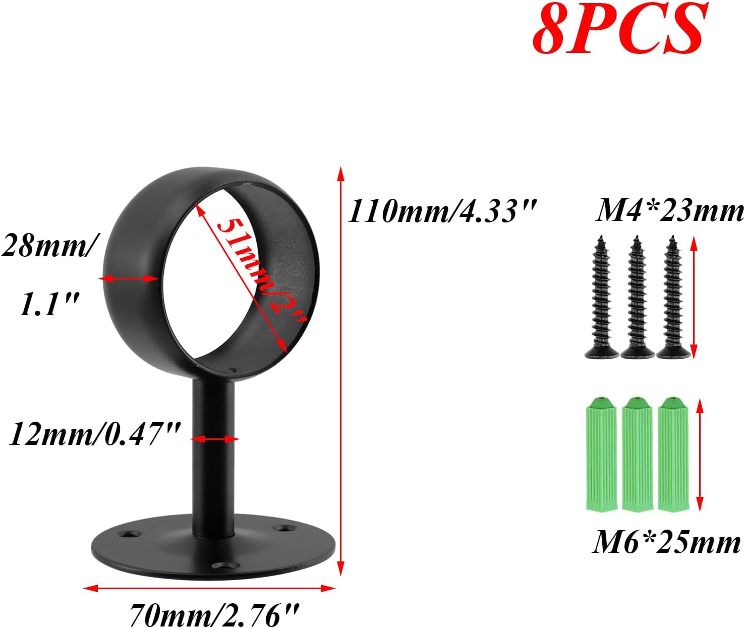Specifications: Product Name: Heavy Duty Closet Rod Bracket Material: Stainless Steel Color: Black Bracket Diameter: 51mm/2inch High: 110mm/4.3 inch Base Diameter: 70mm/2.8 inch Package Contents: 8pcs x Shower Curtain Rod Holders for Wall Some Installing Accessories Notes: 1)The colors may have difference as the different display, please understand. 2) Please allow 1-2mm error due to manual measurement, please make sure you don't mind before bidding.