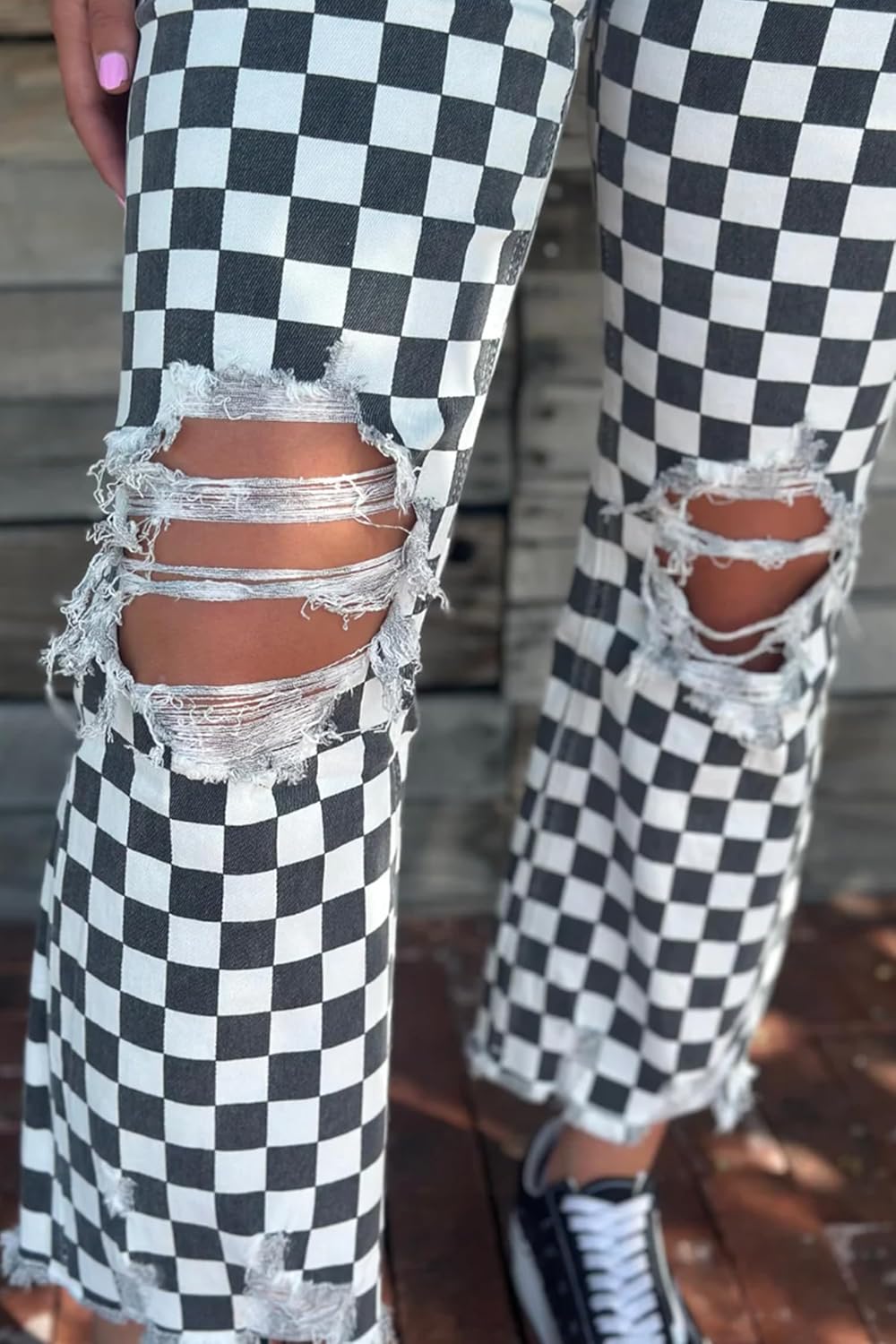 Apvirdy Checkered Print Jeans for Women Fashion Distressed Holes Raw Edge Cropped Jeans High Waist Wide Leg Y2K Denim Pants