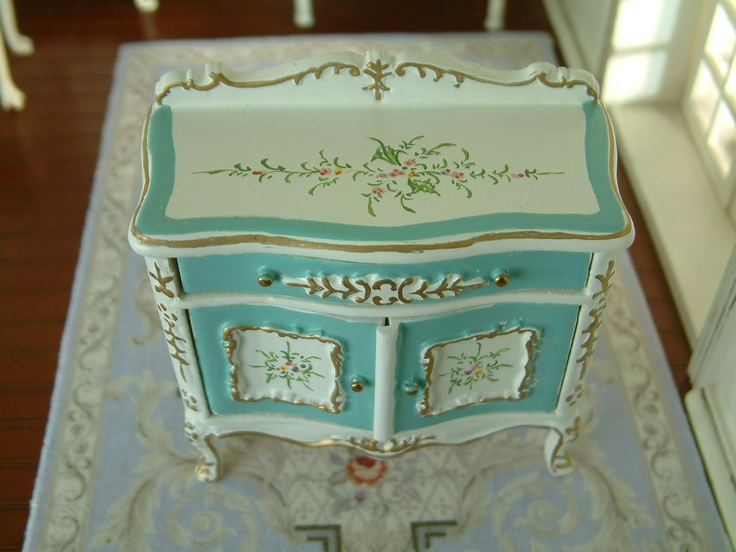 Product name: 1/12 Scale Miniature French Louis XV Royal Blue White Luxury Wood Side Cabinet Scale: 1?12 Materials:Wood Length: 8 cm (3.25 inches ) Width:7 cm (3.0 inches ) Height:3.5 cm (1.37 inches) 1.this is not a childs toy; 2.product is fragile. handle with care.