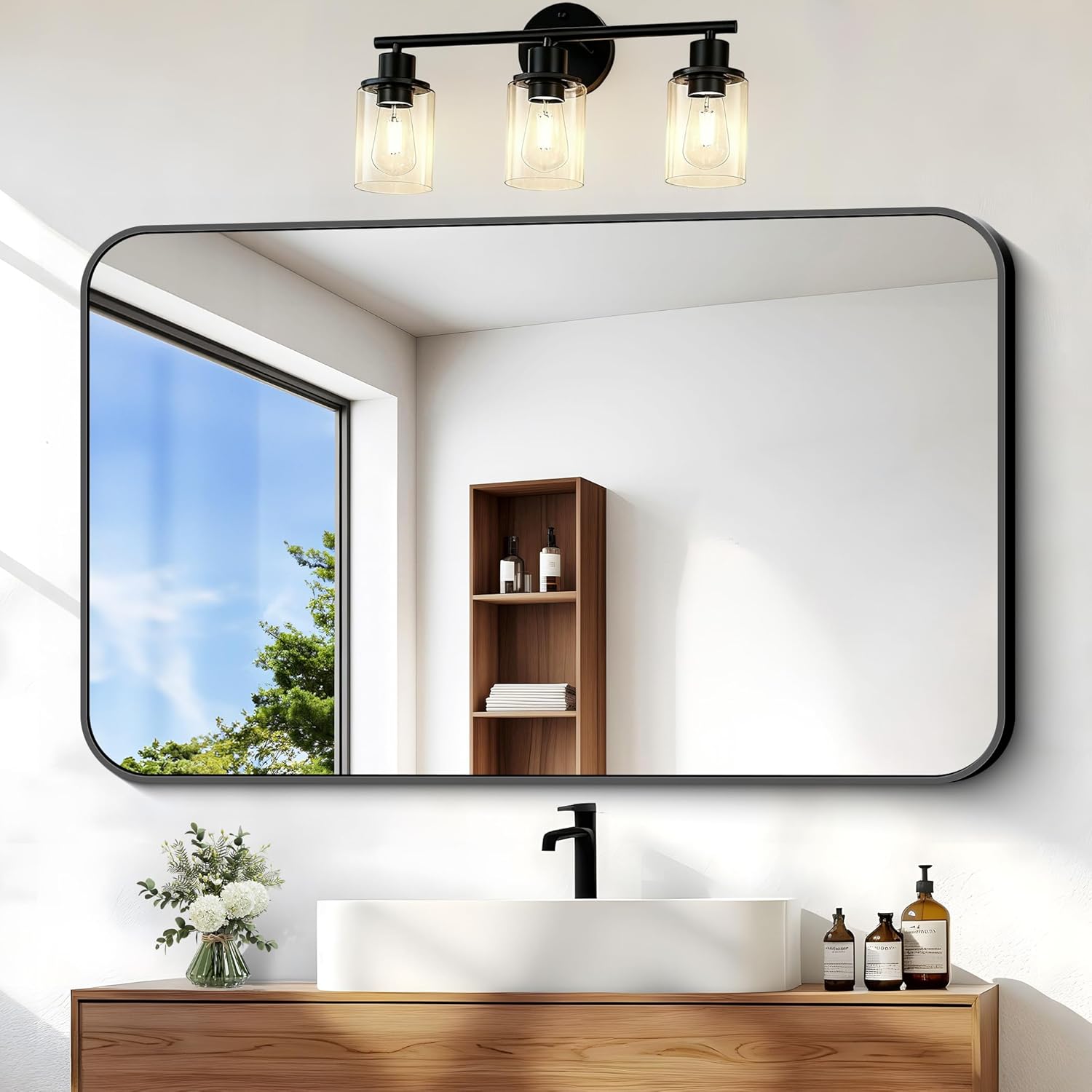 BONEWEI 24x40 inch Bathroom Mirror,Black Rectangle Mirror,Wall Mounted Bathroom Frame Vanity Mirror with Round Corner for Bedroom Living Room,Entryway Hangs Horizontal or Vertical