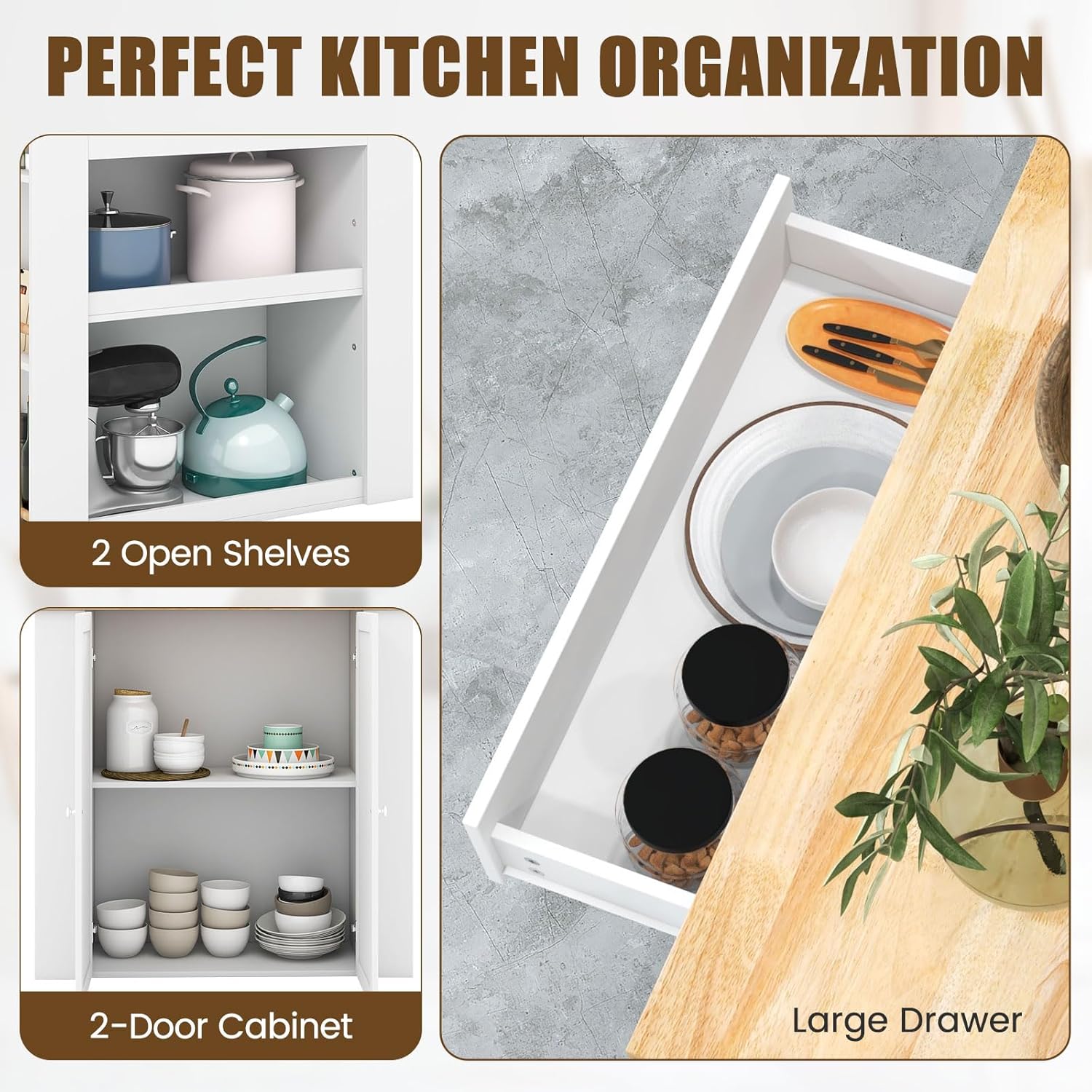 Description:Refresh your kitchen cooking station with a neat and modern look! Design and function meet in harmony with this kitchen island with storage. You can organize all your spices, dishes, beverages and cookware in versatile space. Moreover, the spacious rubber wood tabletop facilitates your food preparation and cooking. Made of thickened engineered wood, the buffet sideboard offers excellent weight capacity. While the protective bars of the racks and raised edges of the front shelves guarantee reliable storage.Features:Large storage on 5 sides - 1 drawer, 1 cabinet, 2 open shelves, 6 spice racksSpacious rubber wood tabletop for coffee bar appliances and food preparation6 protective bars of side racks and raised edges of shelves prevent items’ fallingSturdy engineered wood material for secure and durable useMetal knobs both on the cabinet and drawer for convenient opening and closing Simple to install with step-by-step instruction and all partsSmooth and waterproof surface for easy cleaningAn elegant addition for kitchen, dining room, home coffee barSpecification:Color: White & Natural Materials: Rubber Wood, Engineered Wood, MDFOverall Dimension: 39.5’’ x 29.5’’ x 38’’ (L x W x H)Dimension of Drawer: 26’’ x 11.5’’ x 3’’ (L x W x H)Dimension of Middle Shelf: 28’’ x 13.5’’ x 14’’ (L x W x H)Dimension of Bottom Shelf: 28’’ x 13.5’’ x 18’’ (L x W x H)Dimension of Cabinet: 27.5’’ x 36.5’’ (L x W)Height Between Spice Rack: 7’’/14’’/14’’Total Weight Capacity: 495 lbsWeight Capacity of Countertop: 180 lbsNet Weight: 119 lbsPackage Includes:1 x Kitchen Island1 x Instruction