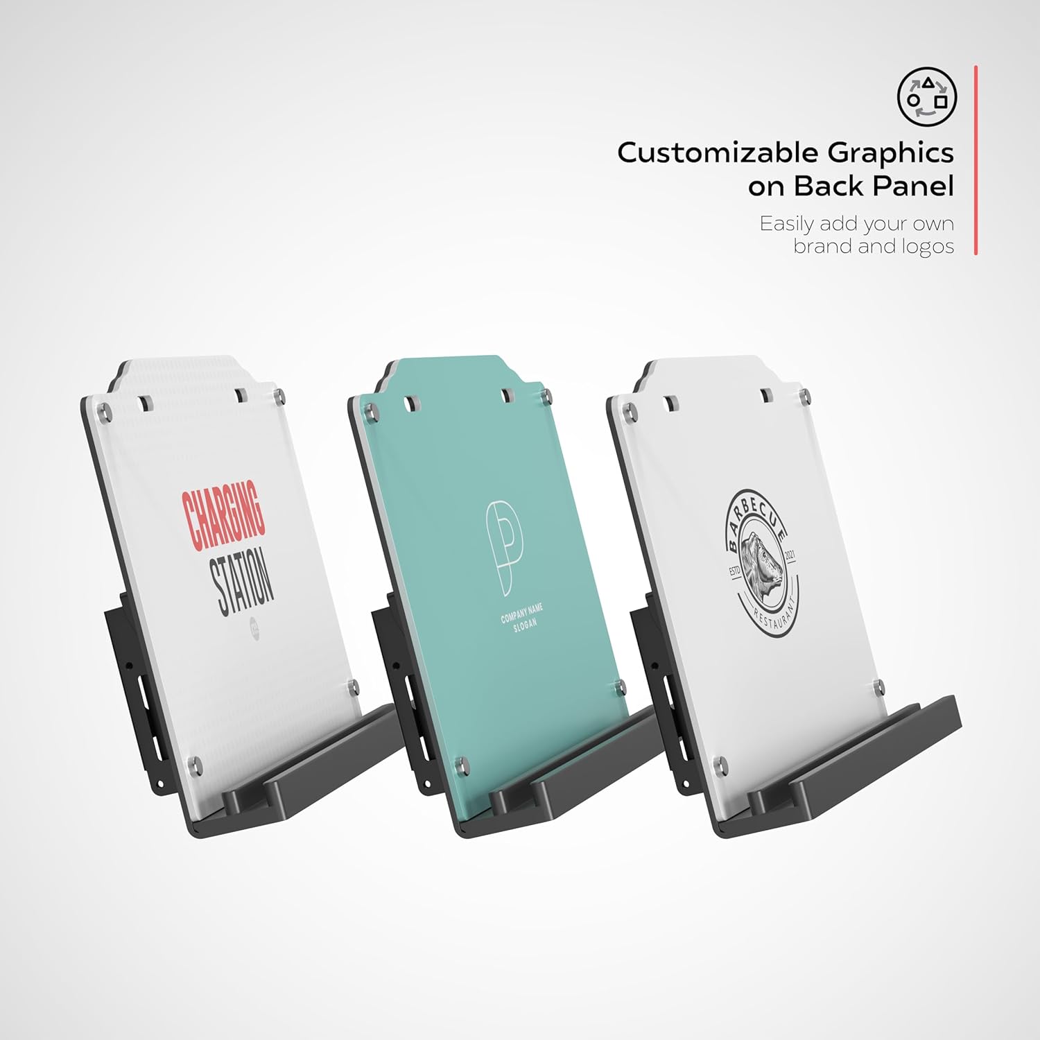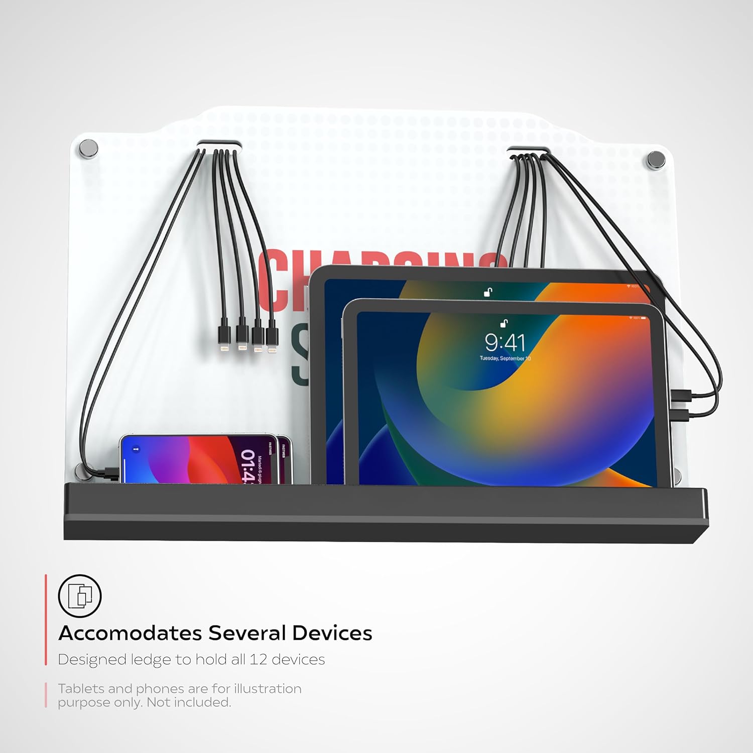 The versatile answer to charging your devices in a compact space. This charging station can be wall mounted with the included hardware. Easily charge up to 12 devices, 6 being with lightning ports and 6 of them USB-C. Simply mount the wall bracket using the provided screws or anchors. Then align the charging station with the side hole matching the bracket. Set your tilt adjustment as desired and tighten in place. The device has a sturdy ledge designed with grooves to hold multiple devices one behind the other, and the ledge has a tilt adjustment from 0-14 degrees. The cables thread neatly through the charging station and connect in the back. When wall mounted, the power cord can either be run through an opening in the wall or down the wall to an outlet. For a stand-alone option, the charging station is easily mounted to one of CTA Digital’s ADD-CHK stand series and has the VESA mount capability.