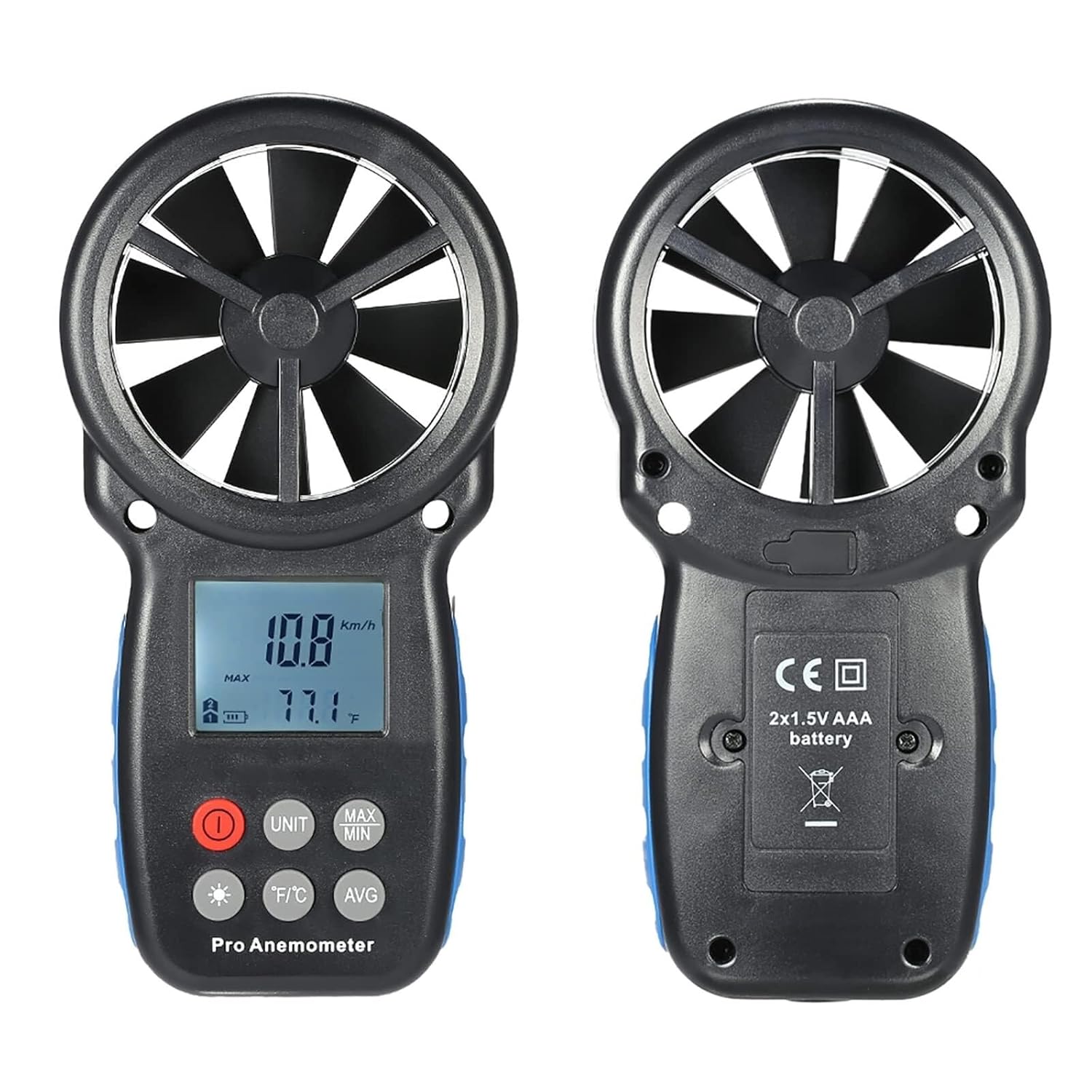 Basic skills:wind speed testair temperature testbacklightManual/automatic shutdownWind speed unit selection (m/s, Fahrenheit t/min, kott, km/h, mph)Maximum value/current value/average valuewind chill indicationTemperature unit selection ('C/'F)real-time measurementProduct Description:Wind speed range: 0.3-30 m/s (up to 69 mph)Wind speed accuracy: 0.1dgtsResolution: 0.1 m/sPower supply: 1.5V (AAA) x2 (not included in the package)