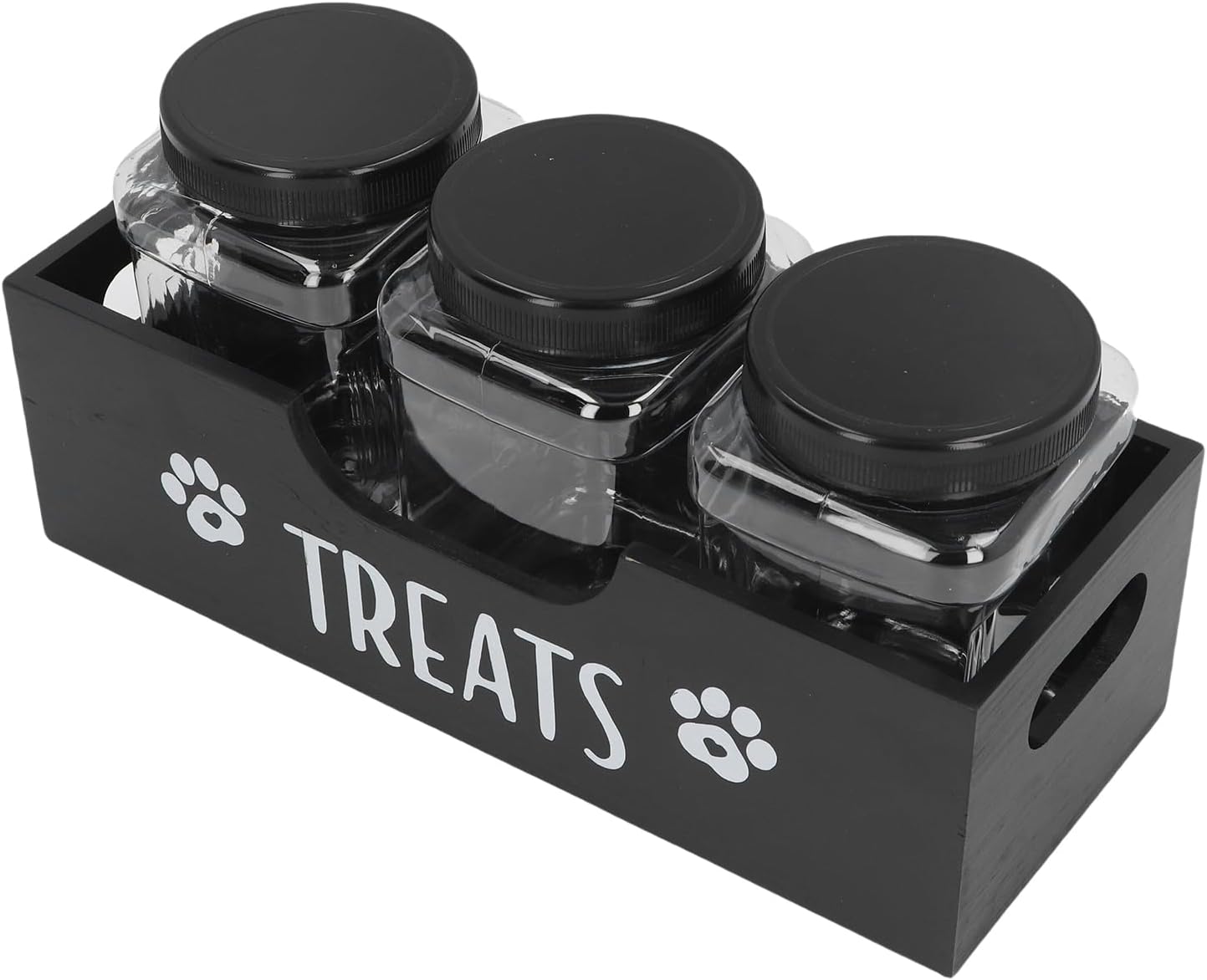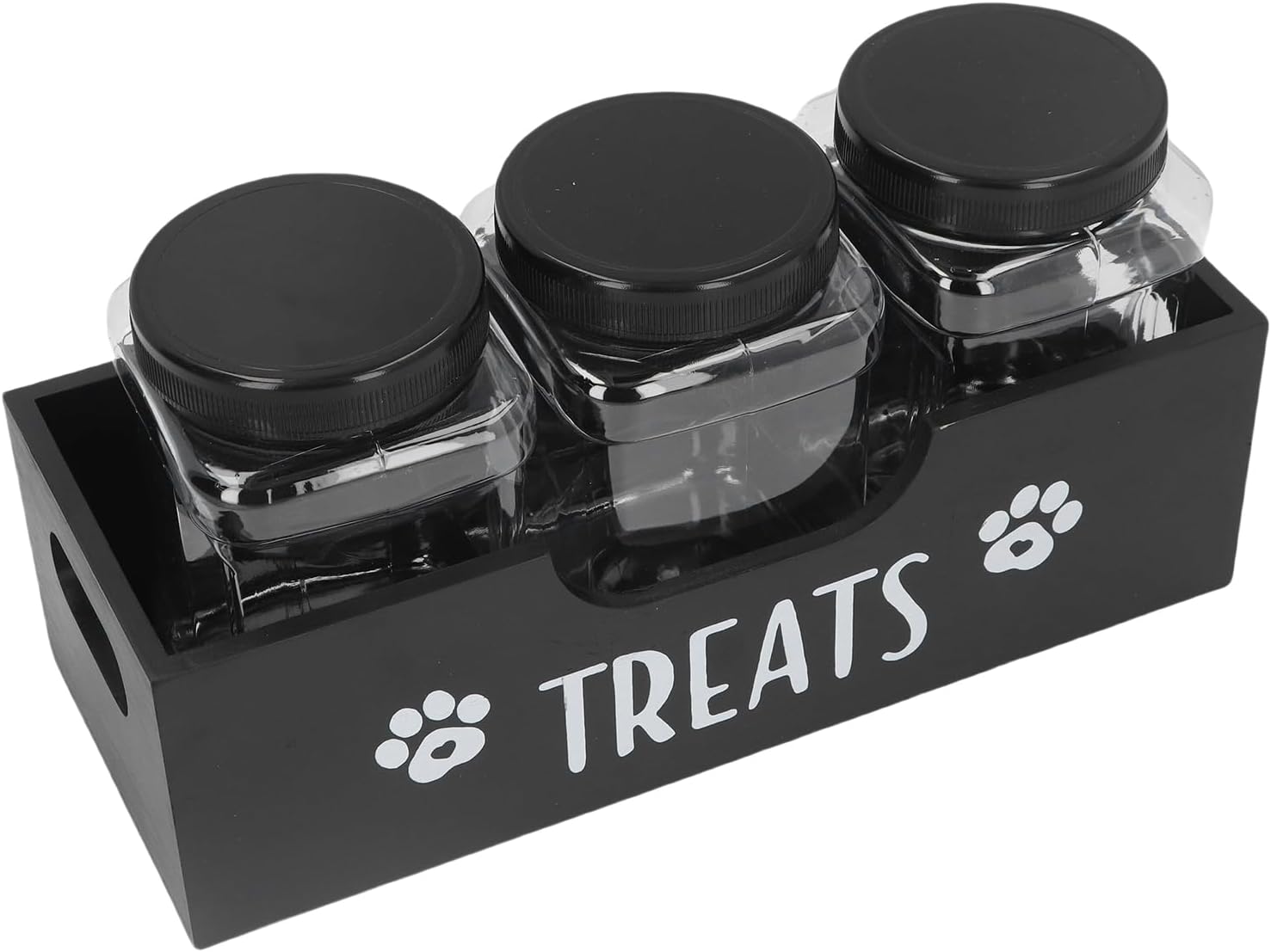 1. Space Saving Design: Our all in one pet treat container set includes three large food grade plastic jars with handles and a storage rack, making it compact yet capable of holding a significant amount of treats. This thoughtful design helps prevent overfeeding, promoting a healthier lifestyle for your furry friends without taking up too much space in your home or while traveling. 2. Effective Freshness Preservation: This dog treat storage jar ensures that your pets' snacks or food stay dry and freshing. The food safe plastic construction prevents curious paws from breaking the jars, ensuring the safety of your pets. With a well sealed design, your furry family members will always have crunchy and flavorful treats to enjoy. 3. Stylish And Functional Storage Solution: If you're searching for a good storage container for your dog or cat's food, this dog food storage holder is a good choice. Its elegant appearance complements any home decor, allowing you to elegantly store various pet treats without having to display unattractive pet food bags in your living space. 4. Promotes Health Feeding Habits: Having a dedicated pet food storage container helps prevent overfeeding, contributing to a healthier lifestyle for your pets. This beautifully designed dog treat can is not only visually appealing but also functional, making it a delightful to pet owners who want to care for their pets in style. 5. Good : Whether you're a pet owner or looking for the good to a pet enthusiast, this kitchen dog treat container set is an excellent choice for housewarming parties, Mother's Day, Thanksgiving, Xmas, or birthdays. Combining practicality, functionality, and aesthetic appeal, this rustic home decor dog food bin makes for a thoughtful and practical that any pet lover will appreciate. Specification: Item Type: Dog Treat Container Material: Solid Wood, Plastic PackageList: 1 x Dog Treat Container 3 x Plastic Cans 1 x
