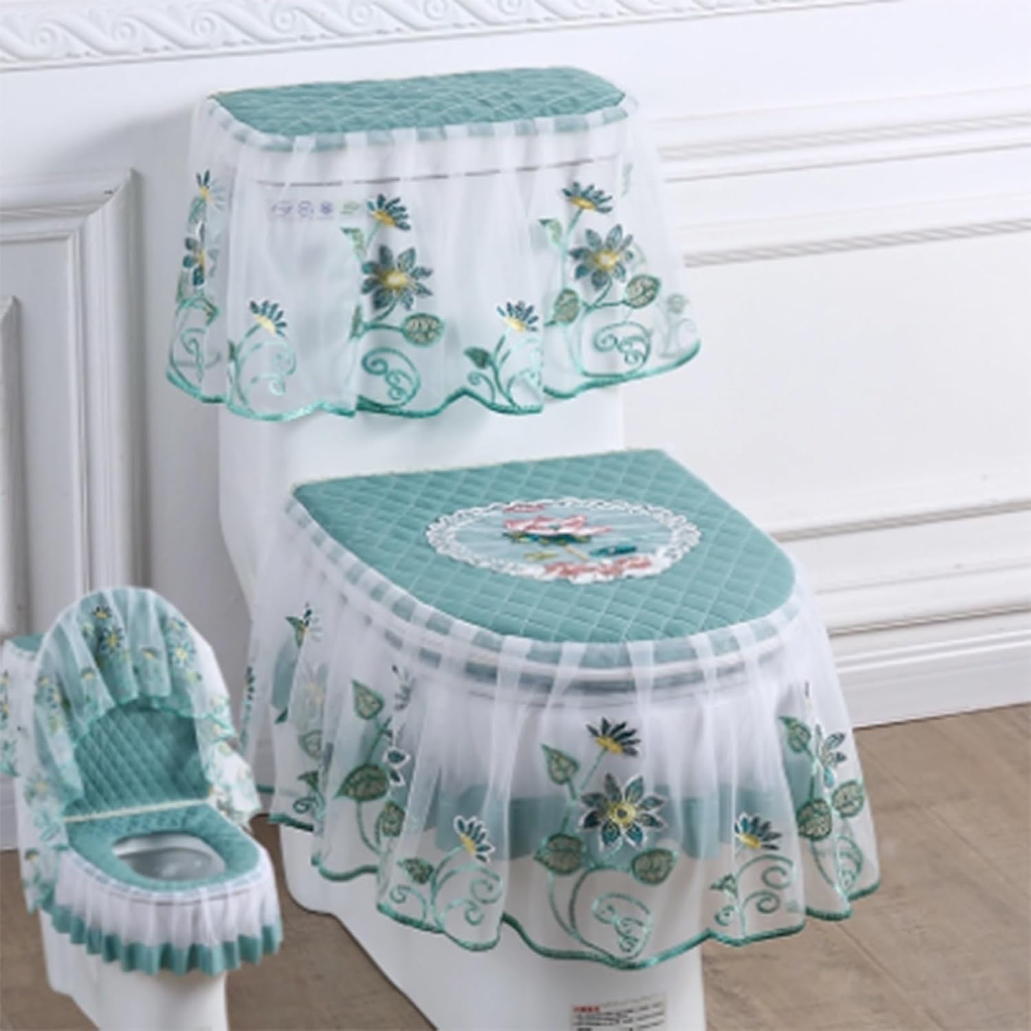 This three-piece toilet seat cover set includes a toilet seat cover, tank cover, and lid cover. Its fully enclosed design effectively reduces dust and keeps your toilet bowl clean. Made of premium, skin-friendly polyester fabric with excellent breathability, it features a reversible design for a fresh, stylish look. The edges are decorated with delicate lace, and the double zipper design allows for easy removal and cleaning. It resists fading after repeated washings and provides warmth and comfort, making it an ideal bathroom accessory for all seasons.Product Name: 3-Piece Toilet Seat Cover SetMaterial: PolyesterCraftsmanship: Lace, wide brim, embroideryFeatures: Soft and comfortable, warm and clean, double zipper, reversibleApplicable: Suitable for U-shaped toiletsDimensions:Toilet seat: 46 x 40 cm (18 x 16 in)Seat and inner ring: 29 x 20 cm (11 x 8 in)Tank cover: 19 x 38 cm (7 x 15 in)Cover thickness: 3 cmPackaging: 1 x Toilet Seat Cover1 Lid Cover1 Tank Cover Set