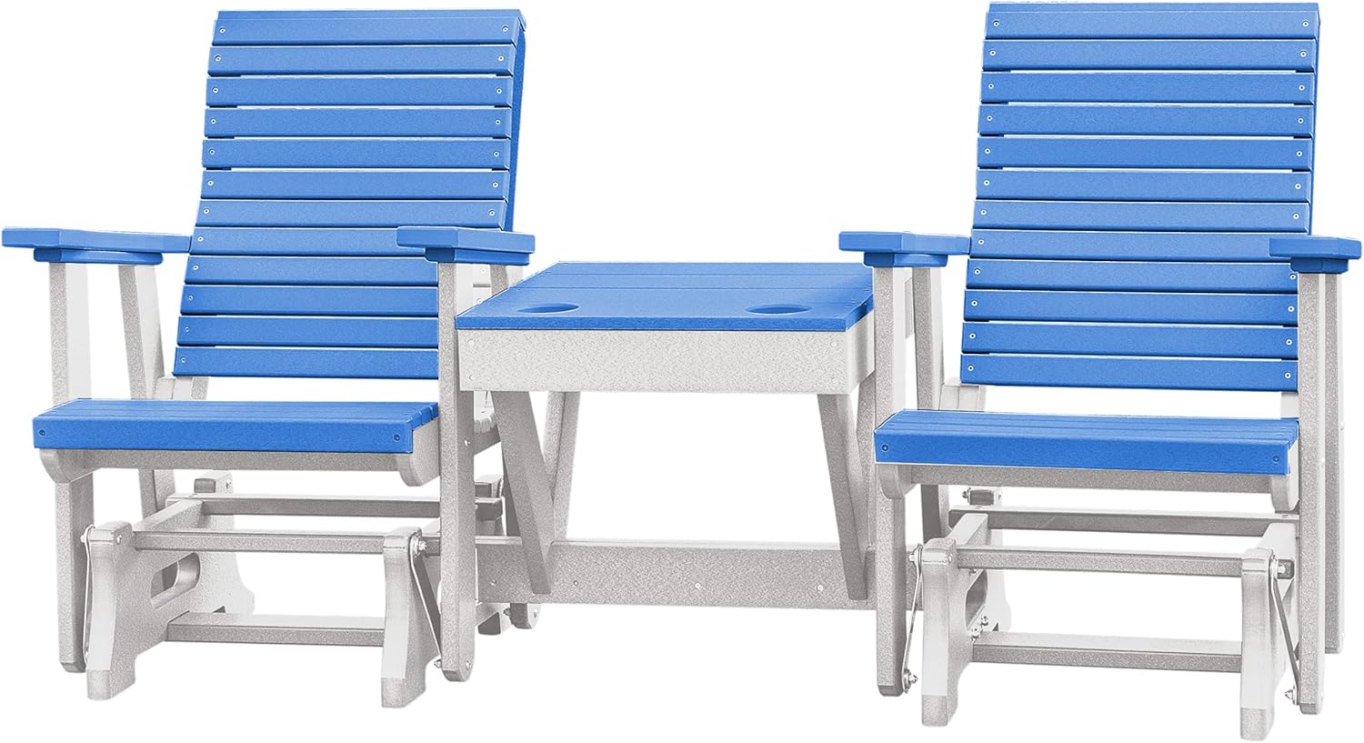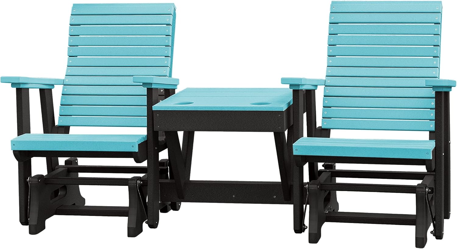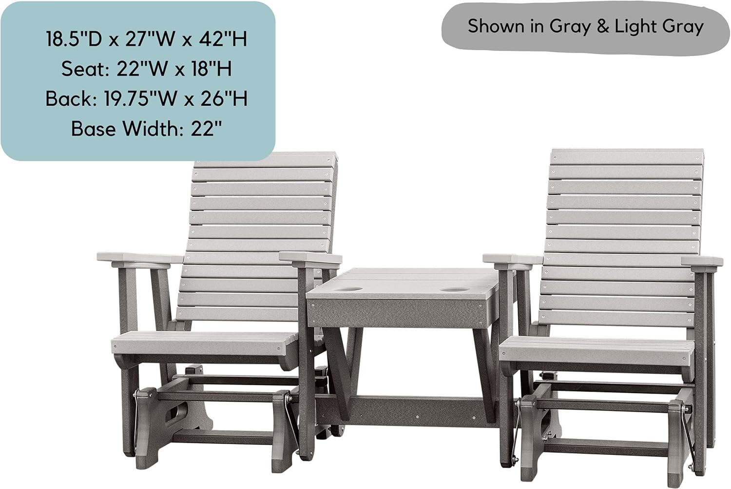 Relax in comfort and style while enjoying your favorite snack or drink. Connected middle table allows for sharable snacks with a friend. Set up around a pool or a cozy firepit and enjoy the view from your new modern horizontal slat patio chair. Updated design features horizontal slats on the back, without sacrificing comfort. Melt the days stress away with the soothing gliding motions. Wide arm rests for ultimate comfort and relaxation. Crafted from durable HDPE plastic, this chair will stand the test of time. Poly is fade resistant, making it perfect for your outdoor patio or backyard space. Choose from several bright and neutral color combinations to blend in or stand out on your outside patio space. Each chair is handcrafted to order by Amish woodworkers in Indiana, USA. Dimensions: 62"W x 48"H - Chair Back: 19.75"W x 26"H - Seat: 18.5"D x 22"W x 24"H - Table: Width in Front: 14", Width in Between Chair Backs: 27" - Weight: 100lb. Ships unassembled in three boxes. Assembly is required, instructions are included.