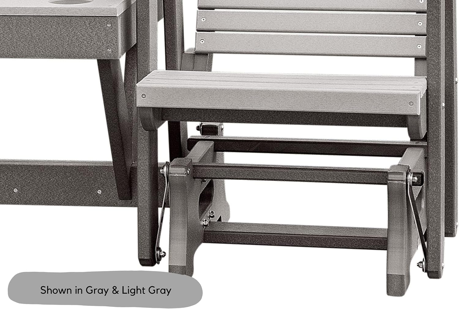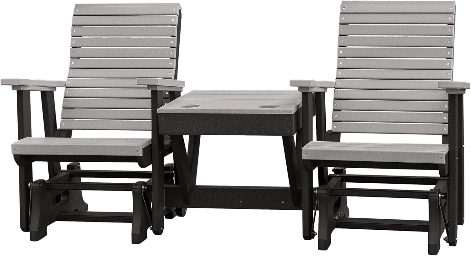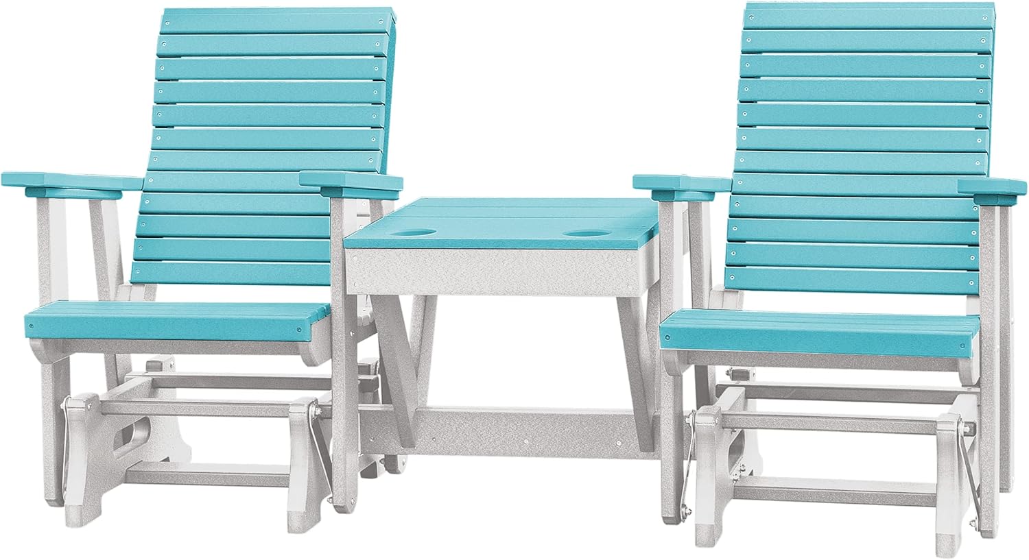 Relax in comfort and style while enjoying your favorite snack or drink. Connected middle table allows for sharable snacks with a friend. Set up around a pool or a cozy firepit and enjoy the view from your new modern horizontal slat patio chair. Updated design features horizontal slats on the back, without sacrificing comfort. Melt the days stress away with the soothing gliding motions. Wide arm rests for ultimate comfort and relaxation. Crafted from durable HDPE plastic, this chair will stand the test of time. Poly is fade resistant, making it perfect for your outdoor patio or backyard space. Choose from several bright and neutral color combinations to blend in or stand out on your outside patio space. Each chair is handcrafted to order by Amish woodworkers in Indiana, USA. Dimensions: 62"W x 48"H - Chair Back: 19.75"W x 26"H - Seat: 18.5"D x 22"W x 24"H - Table: Width in Front: 14", Width in Between Chair Backs: 27" - Weight: 100lb. Ships unassembled in three boxes. Assembly is required, instructions are included.