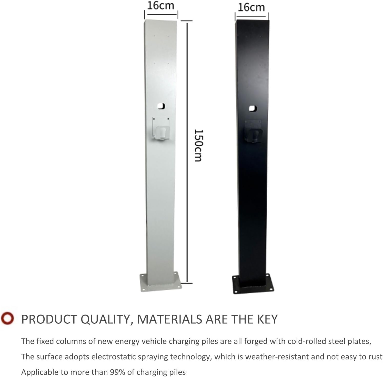 The rise of electric vehicles brings convenience, yet charging can be challenging without proper mounting solutions. This galvanized steel base for electric vehicle charging stations is designed for easy installation on various surfaces including floors, driveways, and sidewalks. It accommodates the height of most users, ensuring quick and easy access to the charger.Product Name: Electric Vehicle Charging Station BaseMaterial: Galvanized Steel PlateDimensions: Height 150cm, Base 24cm in length and 16cm in widthSuitable Locations: Stations, Garages, Company Parking Lots, Factories, Shopping MallsIncluded Components: Charging Station Stand Column*1, Hook*1Features:- Sturdy Construction: Offers a secure installation spot for your charging station.- Wall-Friendly Installation: Eliminates the need for wall drilling, preserving wall integrity and appearance.- Organized Power Cord Setup: Comes with pre-drilled holes for power cords, allowing for a tidy charging area.- Simple Assembly: The bracket is straightforward to assemble and install, with a back panel for charger mounting and a hook for cable management.- Broad Compatibility: Designed to support most electric vehicle charging stations available in the market.