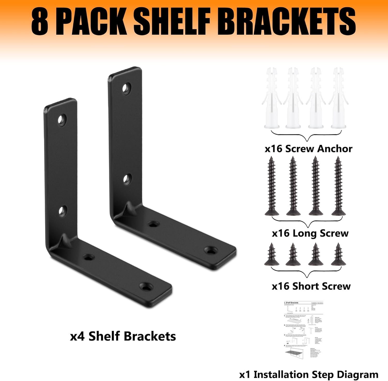 Product DescriptionProduct Description:This L shelf bracket will fulfill the need to place heavy objects on the wall. Not only can you make full use of the narrow space, but also won't damage the original decoration style.Key features:①The surface of the L shelf bracket is treated with black powder double coating and ensures better rust resistance and corrosion resistance.②Thickened heavy duty shelf bracket with upgraded screws can hold up to 160 lbs.③With exquisite bending process we asure you that the brackets are totally 90° in horizontal.④This shelf bracket can be installed in the direction of your preference.⑤These floating shelves brackets match with various wood boards.Package includes:8x l shelf brackets16 x long screws16 x short screws16 x screw anchors1 x Installation Instruction
