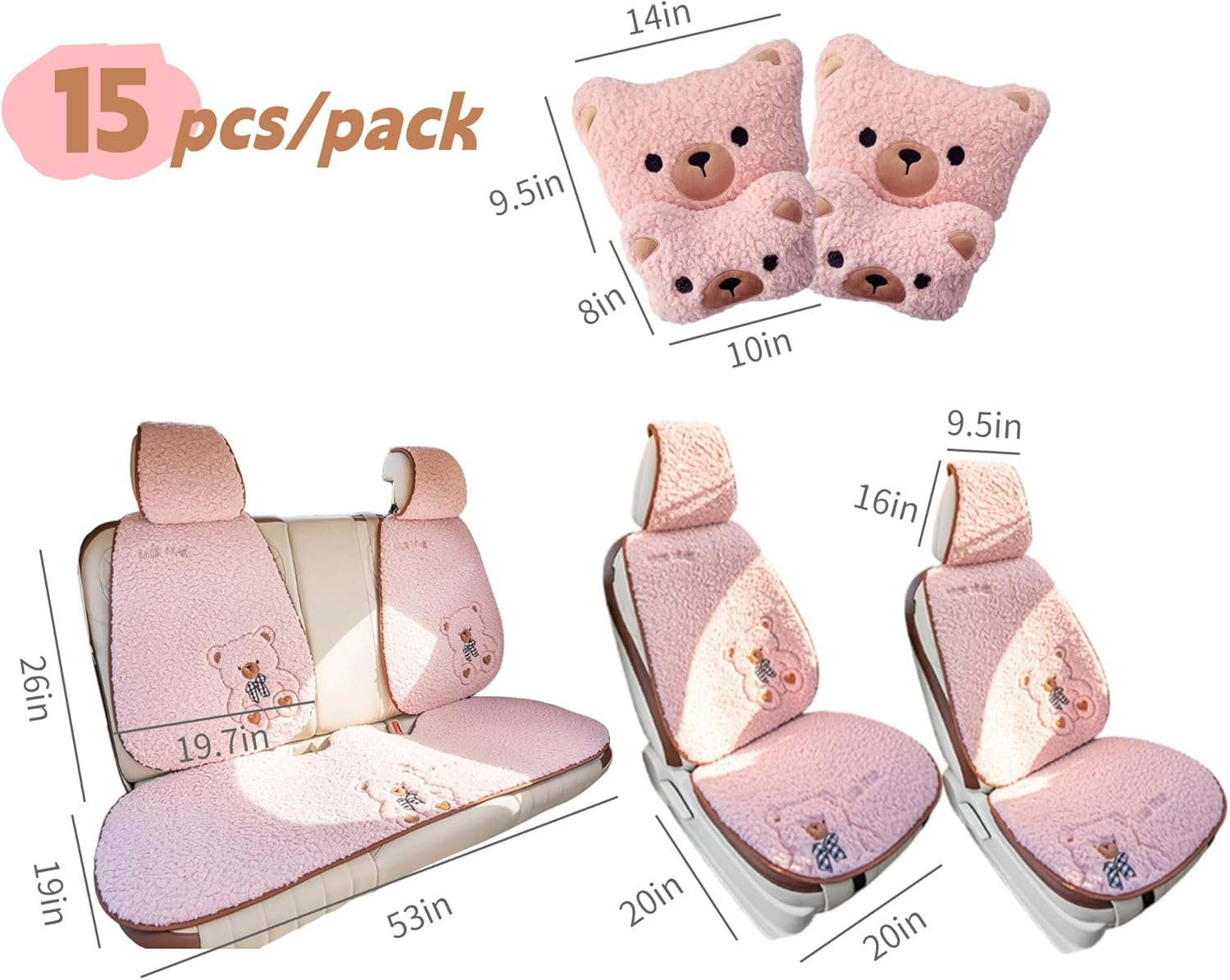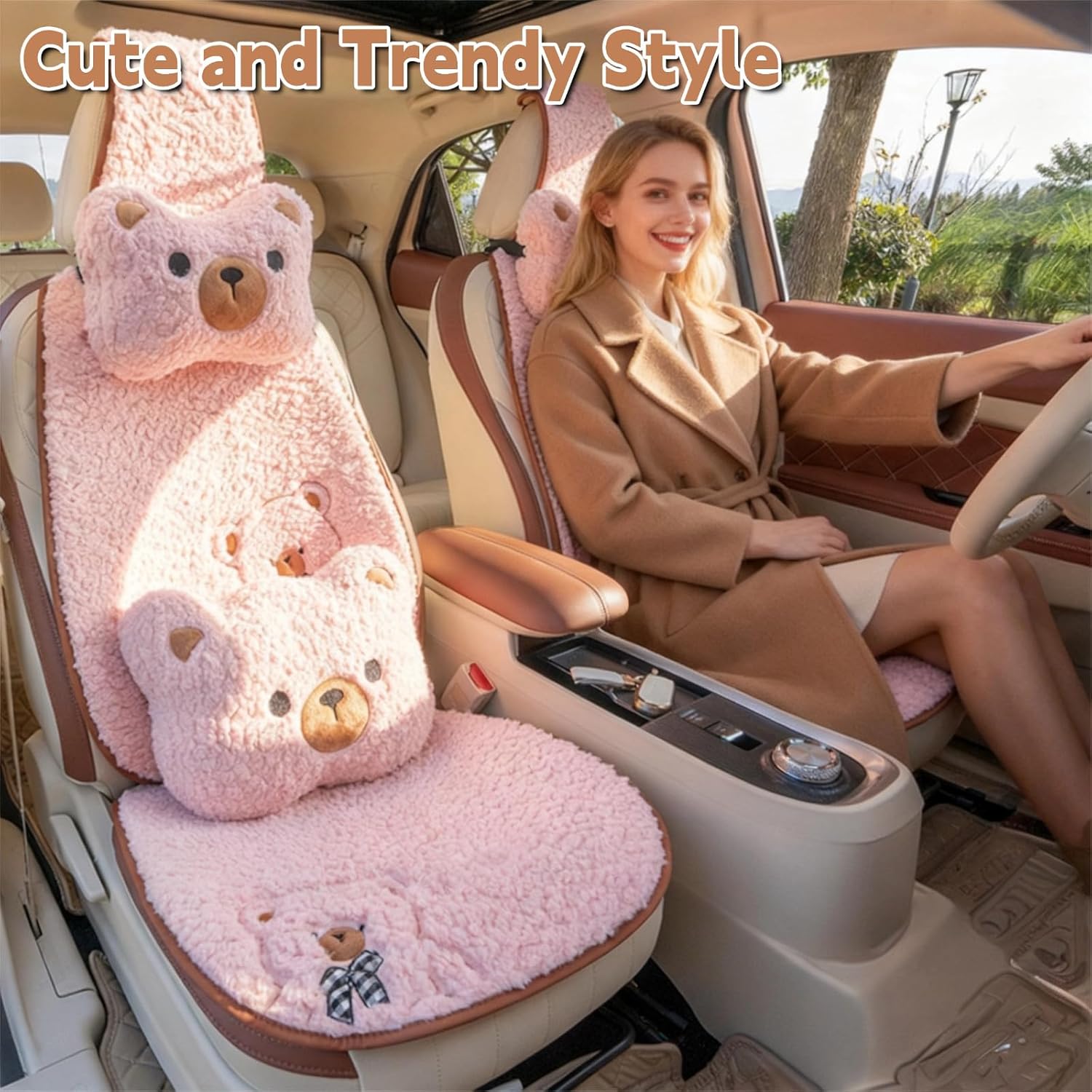 Transform your car's interior with these adorable cartoon bear car seat covers that perfectly blend comfort with style. The thickened, fleece-lined cushions feature charming bear designs and are available in pink, grey, beige or black options. Universal fit makes them compatible with most vehicle seats, while the non-slip backing ensures they stay securely in place. These plush seat covers provide warmth and coziness during your drives, with full coverage for both front seats. The faux sheepskin material offers a soft, luxurious feel while protecting your original upholstery from daily wear and tear. Each set includes two front seat covers with detailed bear faces and decorative elements like checkered bows and heart accents. Perfect for car owners looking to add a cute, comfortable touch to their daily commute while maintaining seat protection.