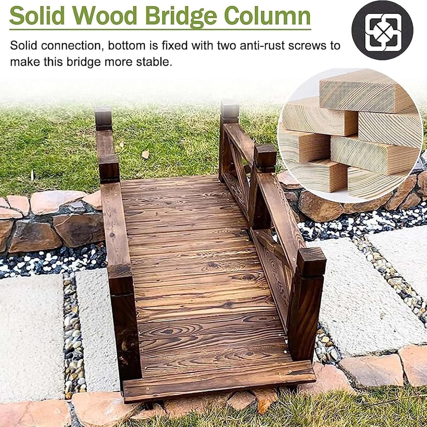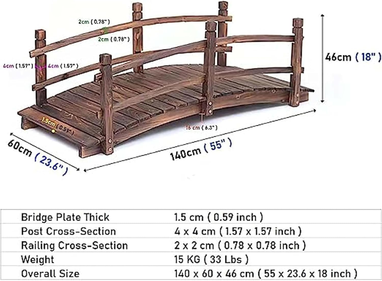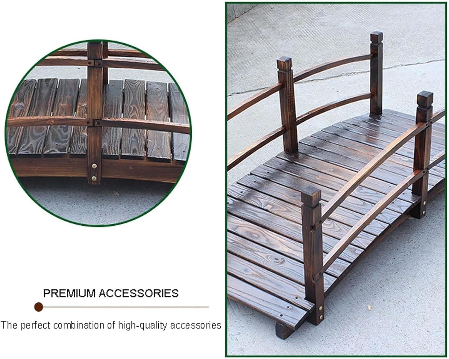 The decorative wooden bridge is perfect for decoration in the garden, the backyard, near the pond or any other landscaping.Specification:- Material: Wood- Weight Capacity: 250 kg / 550 lbsFeatures:- Natural wood strong construction, and looks fashionable.- Handrails on both sides prevent rolled-over for safety.- Solid arch frame to fit most landscaping.- The carbonized wood surface prevents rot, cracking, and splitting, suitable for outdoor.- Easy to assemble.- Make a great addition to your pond, creek, garden, backyard, courtyard, patio, farm.Package Content:- 1 × Wooden Bridge (All Install Fitting Included)Warm Prompt:- Please consider the weight capacity before stepping on it.- Due to light and personal differences in color understanding, there will be small color difference, in kind, prevail.- Due to different measurement methods, the error is generally 1-2 cm, and the error range is not within the quality range.Service Guarantee:- We provide high-quality 24-hour customer service. For any questions about the decorative wooden bridge, please contact us by e-mail as soon as possible, and we will answer and solve your questions.