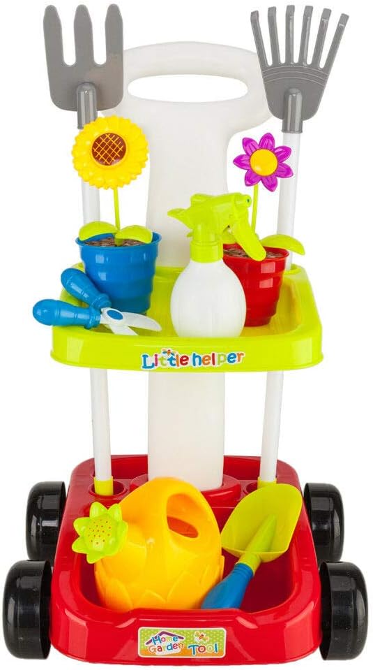 Home Garden Tool Set for Kids Toys w / cart to carry your favorite tools. includes: cart, broom, bucket, rake, sprayer, dust brush, shovel, shower with wheels, scissors, 2 hand tools, 2 water the plants. Cart with wheels and 2 levels for easy manipulation of tools and transfer. Girls can help their parents or grandmothers in the garden of their home. They will be able to rake, water the plants, make holes, prune and many other things. Imitation and learning game. Home Garden Tool Set for Kids Toys w / cart to carry your favorite tools. Includes: cart, broom, bucket, rake, sprayer, dust brush, shovel, shower with wheels, scissors, 2 hand tools, 2 water the plants. Imitation and learning game.
