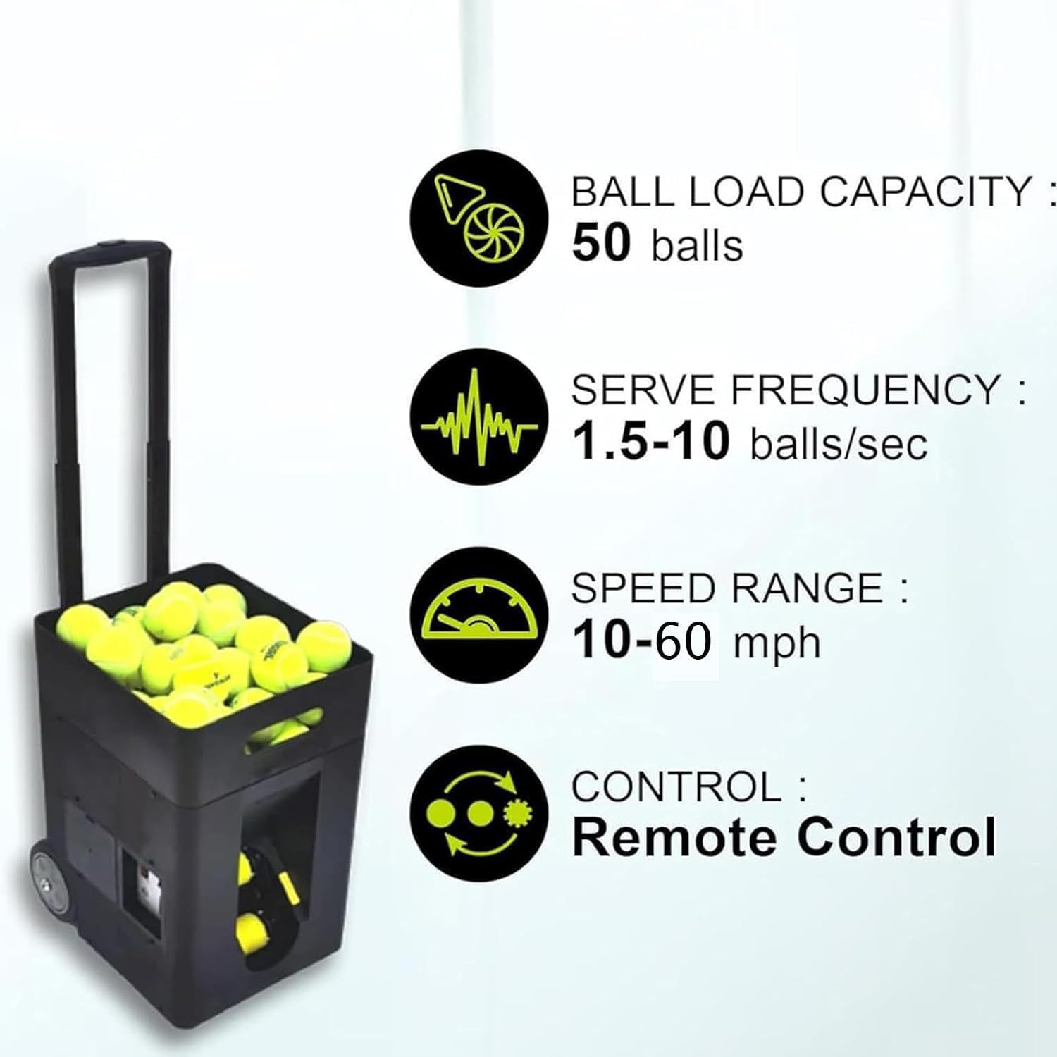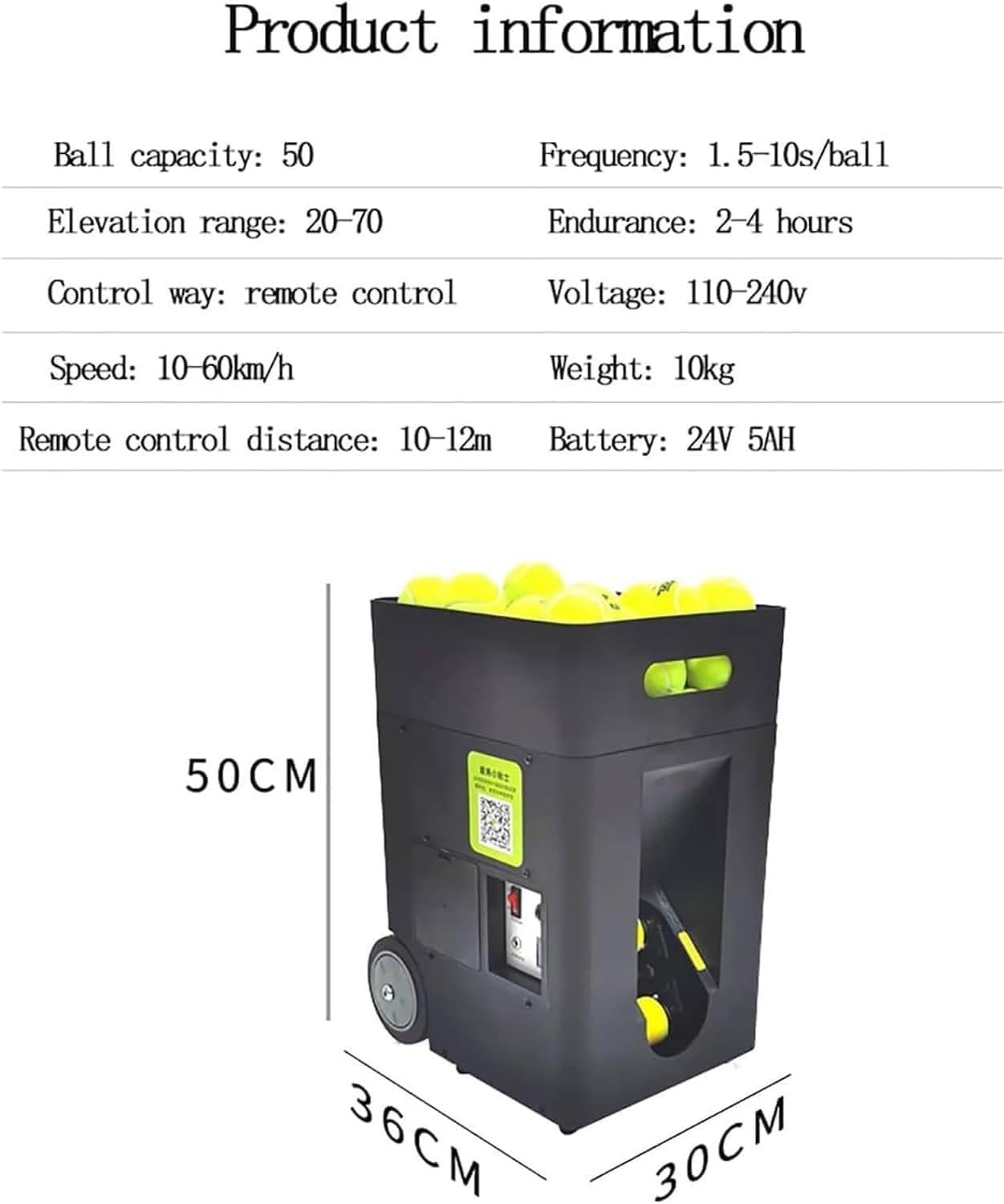 ▶Features:1.This ball serving machine can hold 50 tennis balls, has a built-in removable lithium battery, and a battery life of 2-4 hours.2. The serving frequency is 1.5-10 seconds, which helps improve the players' reaction ability, physical fitness and endurance, and helps players standardize basic movements.3. Equipped with remote control and APP dual-mode control, you can freely adjust the frequency, speed, rotation, depth, elevation and other modes.4. It is small in size, light in weight, equipped with a tug and a pull rod, and is easy to carry.5. Tennis Ball Machine Suitable for beginners,teenagers to practice and coach-assisted teaching, the serving machine has the advantages of stability, affordability and professionalism.▶Specifications:Product Name: Automatic Tennis Ball Launcher/Smart Automatic Ball Throwing MachineBall Capacity: 50 Balls (Not Included)Frequency: 1.5 To 10 Seconds/BallElevation Range: 20-70Battery Life: 2-4 HoursControl Method: Remote ControlSpeed: 10-60km/HRemote Control Distance: 10-12mCharging Voltage: 110-240vBattery Attribute: 24V5AHWeight: 10KgProduct Size: 50*36*30cm▶Product Includes:Tennis Serving Machine *1Battery *1Remote Control *1Charger *1Instruction Manual *1