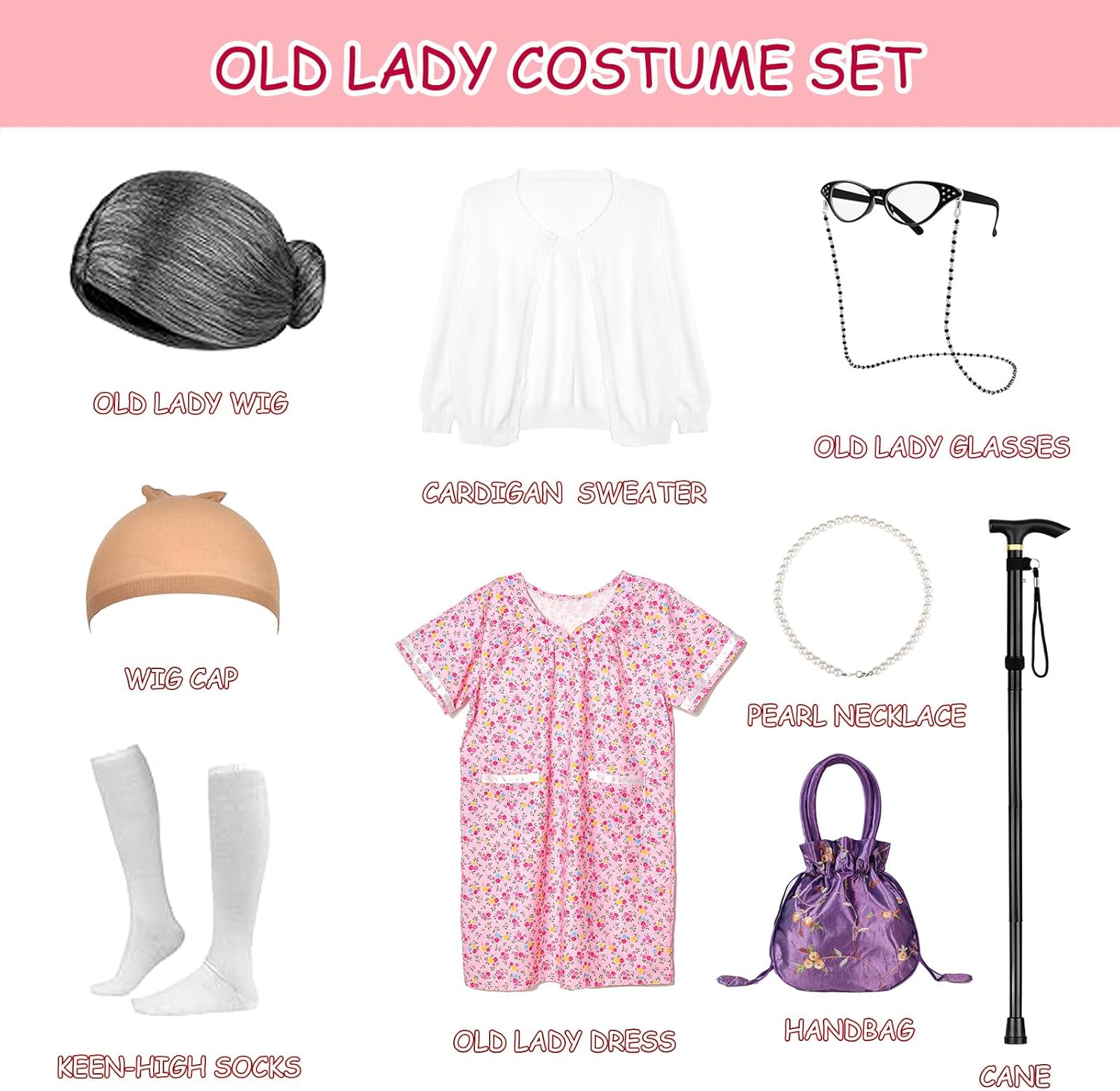 | Included Components | old lady wig with cap,old lady dress,cardigan sweater,old lady glasses with chain,pearl necklace,foldable cane,socks,bag, |