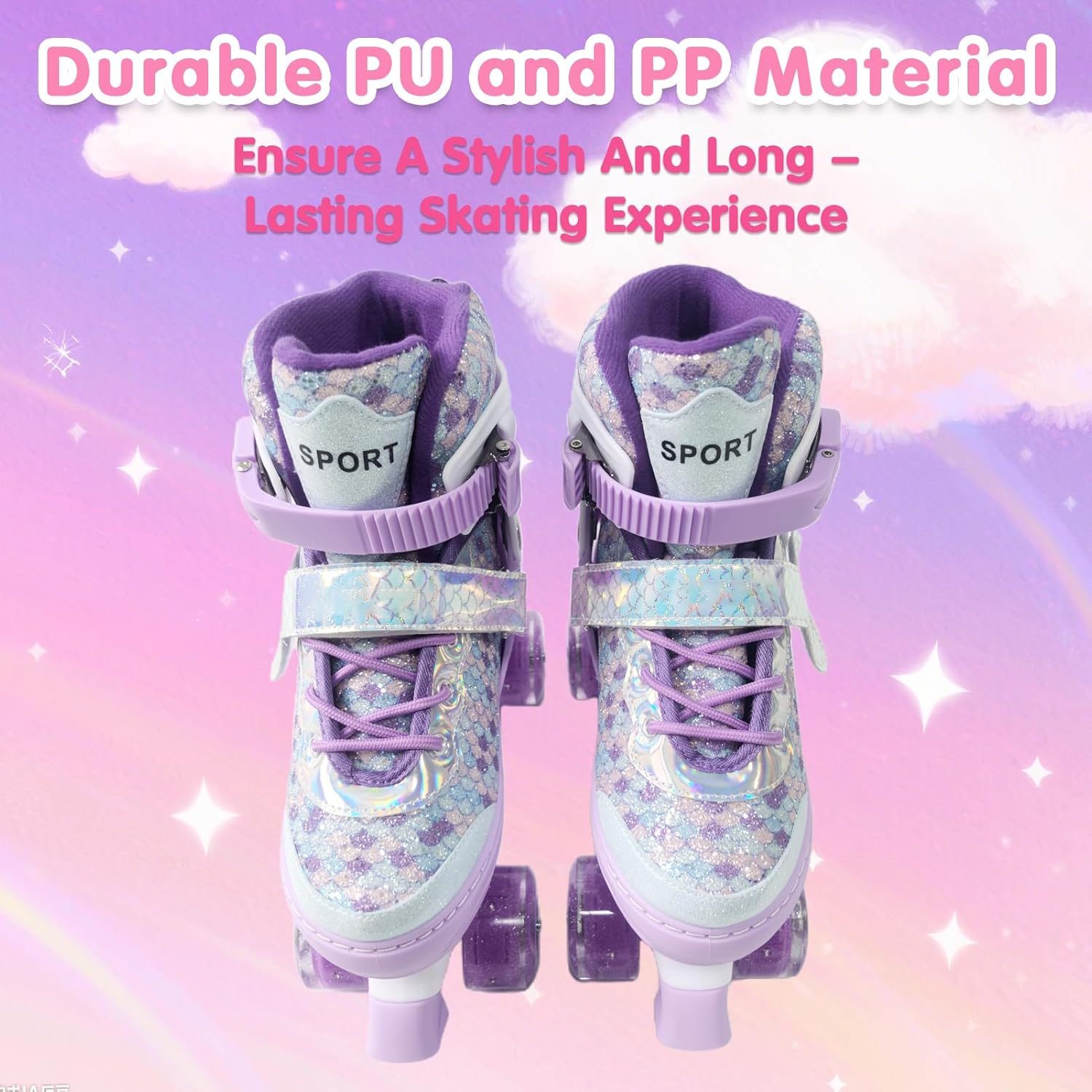 [Triple Ankle Protection] Safety is a top priority with these roller skates featuring triple ankle protection for added stability and support. the reinforced ankle padding and secure straps prevent injuries and provide confidence for young skaters. ideal for both indoor and outdoor use these skates ensure a safe and enjoyable experience. [Adjustable Sizes for Growing Feet] With four adjustable sizes these roller skates can grow with your childs feet ensuring a perfect fit for kids of different ages. the easytoadjust mechanism allows for quick resizing without the need for tools. suitable for foot lengths ranging from 170mm to 245mm accommodating various age groups. [Eyecatching Fish Scale Design] These roller skates feature a unique fish scale design that immediately grabs attention and appeals to kids making them a perfect surprise gift. the vibrant colors and playful pattern ensure your child stands out while skating. the design is not only stylish but also durable to withstand rough use. [Flashing Led Pu Wheels] The skates come with vibrant flashing led pu wheels that light up both day and night adding an ​ of fun and safety. the wheels are designed to shine brightly without batteries making them hasslefree and longlasting. kids will love the colorful light display as they skate around. [Smooth Abec Bearings] Equipped with highquality abec bearings these roller skates provide a fast and smooth skating experience. the precisionengineered bearings reduce friction allowing for effortless ​ and better control. perfect for both beginners and experienced skaters looking for a reliable performance. Spec: Material: PP and PUSize: S, M, L (Optional) Size Information: - S: 28-31 (Approx. 170-190mm / 6.69-7.48in) - M: 32-36 (Approx. 200-225mm / 7.87-8.86in) - L: 37-39 (Approx. 230-245mm / 9.06-9.65in) Weight: - S: Approx. 2250g / 4.96lb - M: Approx. 2350g / 5.18lb - L: Approx. 2450g / 5.40lb