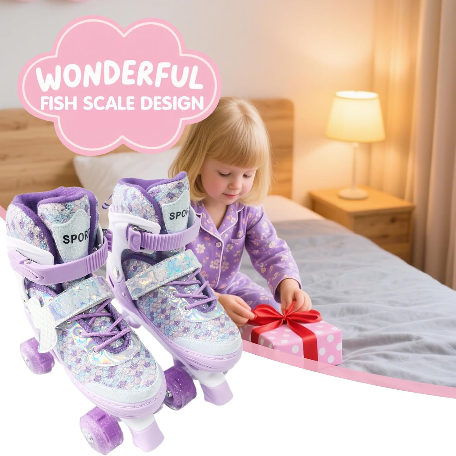 • [Eyecatching Fish Scale Design] These roller skates feature a unique fish scale design that immediately grabs attention and appeals to kids making them a perfect surprise gift. the vibrant colors and playful pattern ensure your child stands out while skating. the design is not only stylish but also durable to withstand rough use.