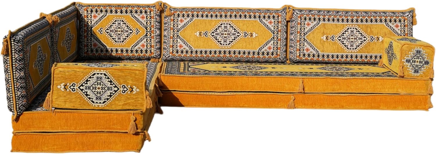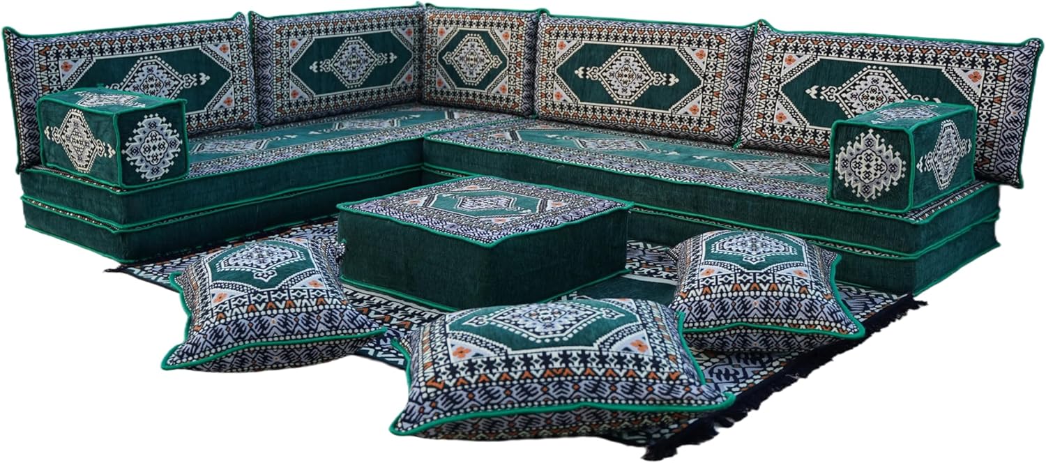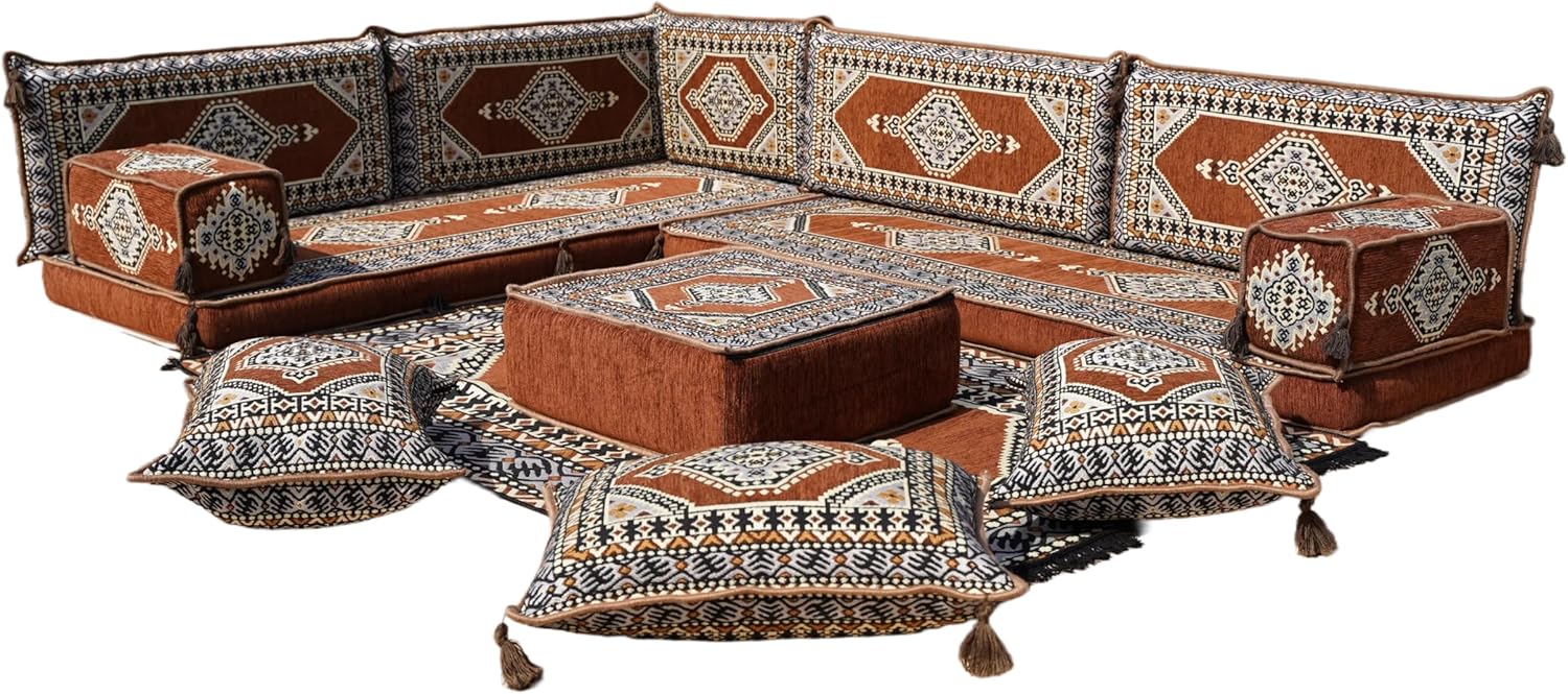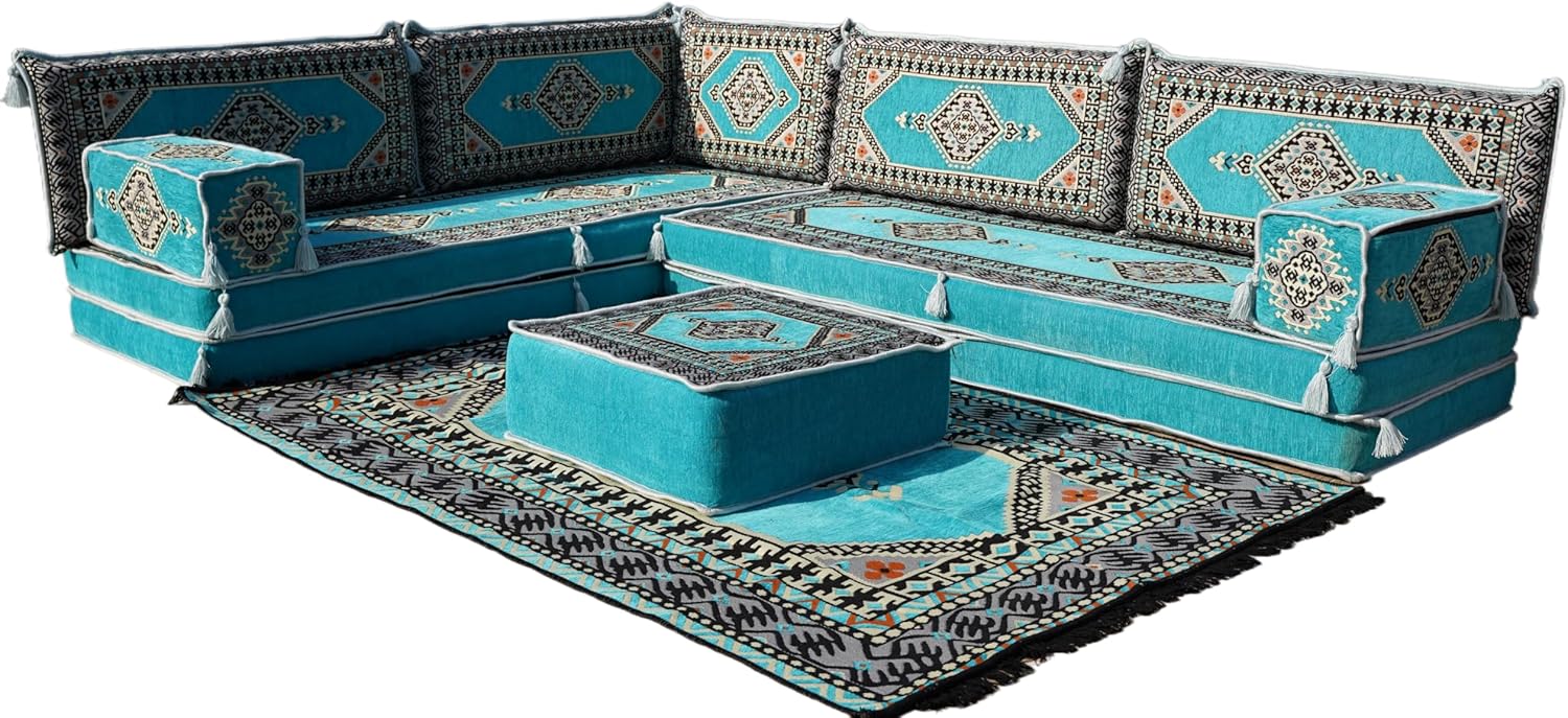 You will receive products in the variant you selected from the listing page. This sofa set comes in 14 separate pieces. If you choose 'L Sofa Full Set / 4'' Thickness' you will get these: -2 Floor Seating Cushions (190 x 70 x 10 cm / 75 x 27 x 4 inch) -4 Backrest Pillows (95 x 40 x 10 cm / 37 x 16 x 4 inch) -1 Backrest Pillows (60 x 40 x 10 cm / 24 x 16 x 4 inch) -2 Armrest Pillows (50 x 20 x 20 cm / 20 x 8 x 8 inch) -1 Matching Rug (140 cm x 210 cm / 55 x 83 inch) -1 Ottoman Couch (60 x 60 x 20 cm / 23 x 23 x 8 inch) -3 Pouff Pillows (70 x 50 / 27 x 20 inch) * The floor sofas are not freestanding, they need to lean against a wall or something hard behind * We can customize this product upon your request * All covers include their foam filling inserts * All covers are zippered * Beautiful texture and soft to touch * Comfortable to sit or sleep on * Top-quality finish and workmanship * Excellent for homes, offices, hotels, cafeterias, etc. * Machine washable