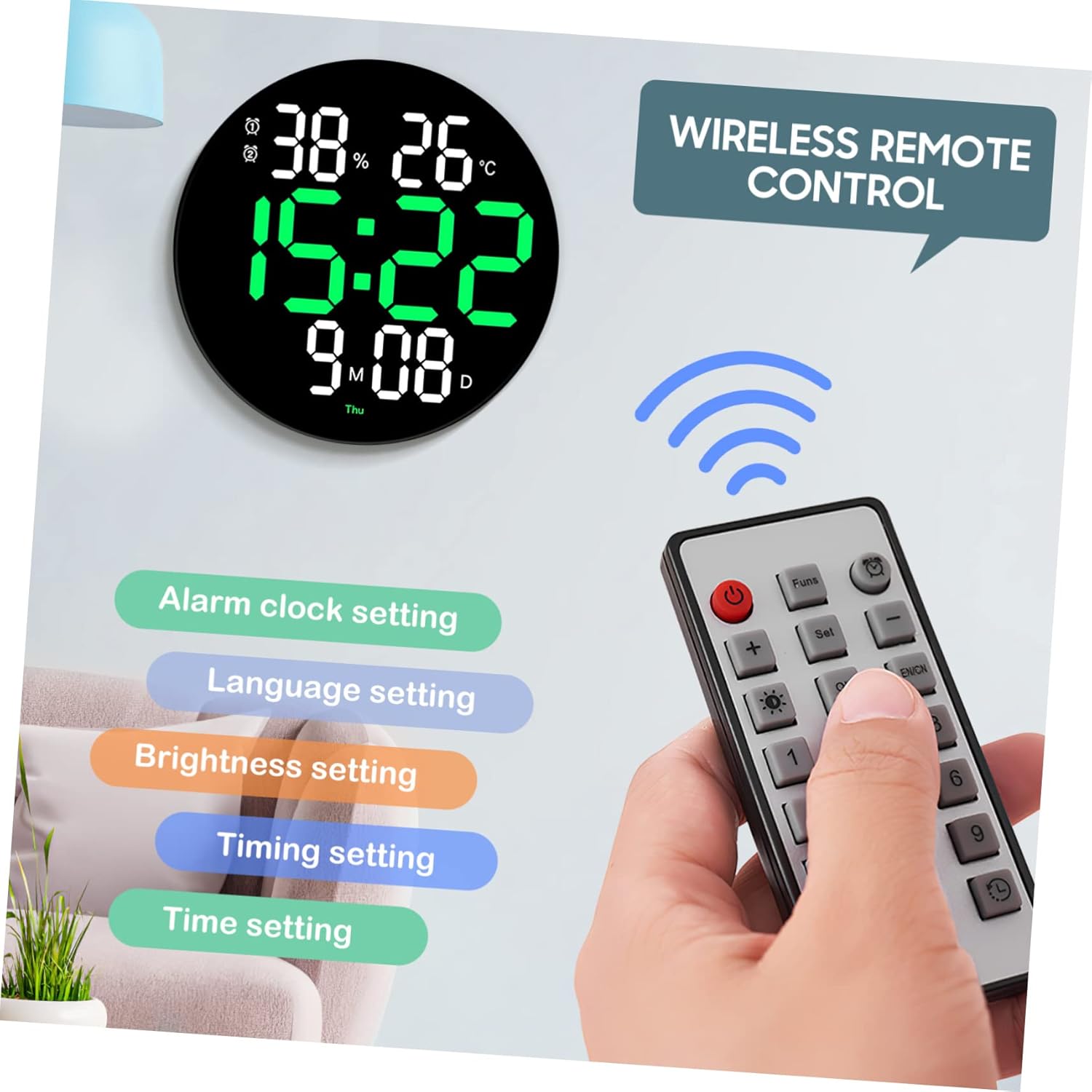 Package Include 1 Wall Clock 1 x 3.5m USB Cable 1 x Remote Controller 1 x User Manual Features -Material:Acrylic, Plastic wall clock digital -Display Screen Type: LED alarm clock digital -Size:25.20X25.20X2.80cm/9.90X9.90X1.10in living room clocks wall -Movement Type: Electronic digital clock for living room -Battery: 2 x AAA Batteries LED digital alarm clock -Display Type: Number wall decor clocks -Color:Black LED clock This digital wall clock uses big number and large screen design, which allows you to see the data clearly from long distance digital alarm clock. You can use this digital wall clock on many different occasions, such as home, kitchen, living room, bedroom, office, classroom, etc digital clock wall. The digital wall clock comes with a remote controller, which allows you to adjust 10 levels of brightness digital LED wall clock. LED wall clock has multiple functions, including week display, date display, humidity display, temperature display, brightness adjustment, two alarm clocks, remote controller, forward/countdown and multiple lamp colors, which is practical LED digital clock. There is a hanging hole on the back, can install this clock on wall or place it on the table digital wall clocks.Goods Informationwall clocks for living room You can place on the desk or on the wall.led clock It has accurate time and multiple functions, which meets your daily use needs.wall LED clock It has wide applications, and also a wonderful present for your family or friends.clocks for living room wall This product is a multifunctional and practical round LED digital wall clock