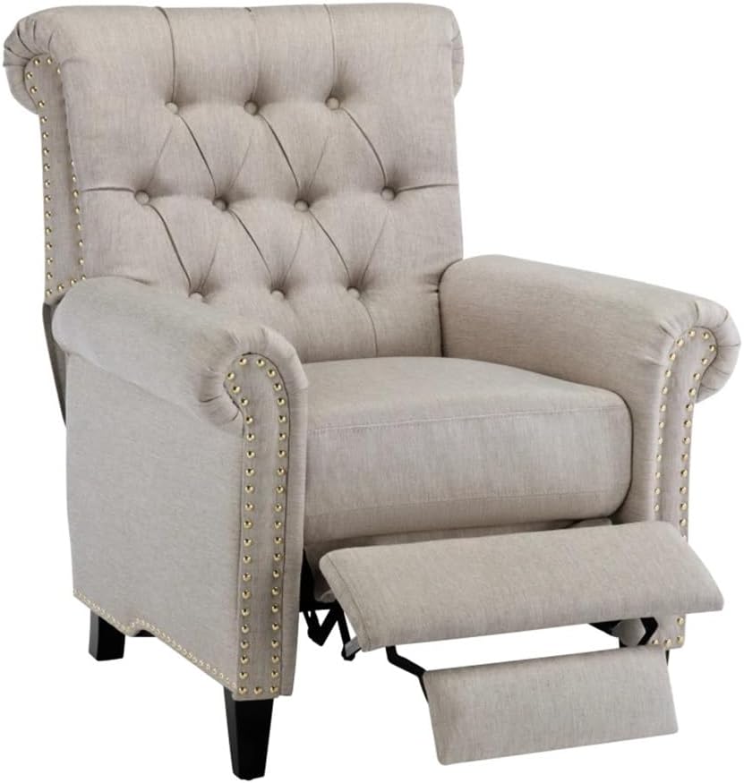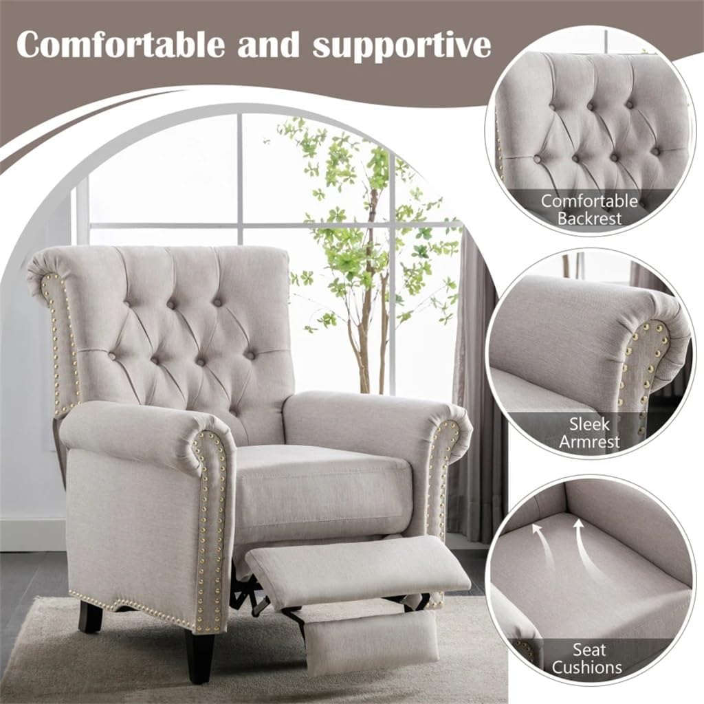 The polyester upholstery is embellished with diamond-stitched button tufting, completing the traditional charm of this eye-catching chair.The generously padded seat and chair back and wood frame construction add to the comfort of this deluxe chair.Easily push back to activate the reclining mechanism and fall into a cradle of comfort. for any space from the living room or family room to study or home office. Structure & Easy to Assemble: This recliner chair with a quality iron frame ensures long-term use, while the structure follows the scientific principle so that the recliner chair is strong enough to withstand a weight of 330 lbs.Optimal softness and extra cushions bring a relaxed and cozy feel to the ChairFabric Material LinenLeg Material WoodSize:As shownSet Includes1* Sofa Chaise(no other presentation items included).Notice:1. Due to manual measurement, please allow 2-3% error, before you bid, please make sure you don't mind.2. The color may vary due to different displays, please refer to the actual product.