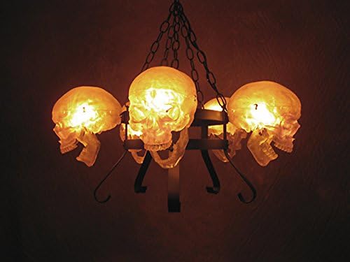 Life-Size glowing skull chandelier, made with five life-size clear skulls and one inch wide aluminum strips would be great for any Halloween or Horror event. The five skulls are all looking down with there jaws open in horror and each gives off a very eerie glow. It is made in a circular pattern with a diameter of 25" measuring from skull nose to skull nose and a height of 15" from metal base to top of skull, goes up an additional 12" with sturdy chain. The hanging weight is just under 16 pounds. The inside bulb can be changed to give a different effect. The chandelier comes with 7-watt amber bulbs for inside the skull, but can use white, red or any color you wish. The lights easily plugged in to any wall outlet. This chandelier would be great for any Halloween, horror, or gothic event. It definitely helps set an eerie atmosphere.