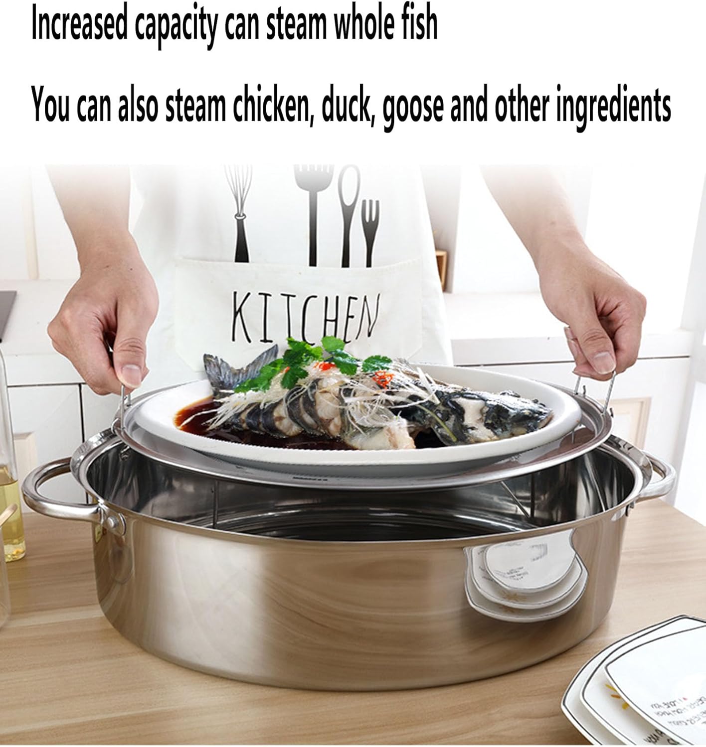 Fish Steamer Pot is made of stainless steel, cooking surface spreads heat quickly and distribute evenly. The polished surface with heatproof design handle is easy to clean. Large Capacity, One person put in the whole fish in the fish steamer. It can accommodate whole fish or turkey. It also can boiling sauce, gravies, pasta, noodles and much more.Color: SilverMaterial: Stainless SteelFinish Type: PolishedShape: OvalIs Dishwasher Safe: YesSize:Extra large:Total length with handle:56cm/22.04inchLongest part of the pot:43.5cm/17.12inchThe widest part of the pot:30cm/11.81inchHeight:10.5cm/4.13inchRegular:Total length with handle:48cm/18.89inchLongest part of the pot:39cm/15.35inchThe widest part of the pot:27cm/10.63inchHeight:9.5cm/3.74inchExtra deep:Total length with handle:48cm/18.89inchLongest part of the pot:39cm/15.35inchThe widest part of the pot:27cm/10.63inchHeight:12.5cm/4.92inch