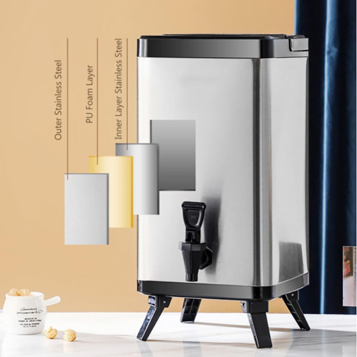 Product Name: Square Insulated BucketProduct Material: 304 Stainless SteelSpecifications: 6/8/10/12LProduct colors: black, gray, whiteApplicable: coffee shops, cold drink shops, family gatherings, etcThis beverage dispenser is an elegant and affordable addition to your buffet, hotel, or dining event, perfect for providing your guests with fresh coffee, tea, hot water, milk, juice, cold drinks, and more