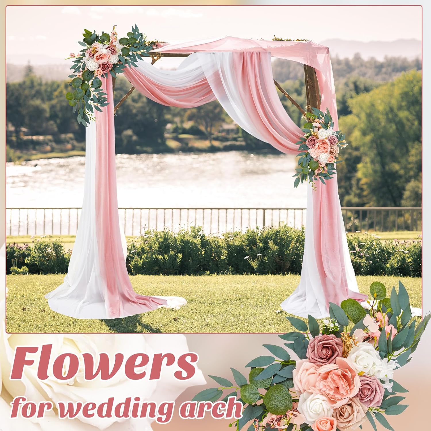 Features: Wedding arch decorations offers a comprehensive solution for your wedding arch decoration. It's the nice enhancement for any wedding occasion, whether outdoor or indoor. Besides weddings, the uses of drape fabrics can also decorate stair railings, tables, curtains and other elements of home decor, adding elegance to any setting. Specifications: Material: polyester cloth, chiffon Color: white and pink Size: Main flower: 27.6 inches/ 70 cm Secondary flower: 19.7 inches/ 50 cm Drape fabrics: 29.5 x 236.2 inches/ 75 x 600 cm Package includes: 1 x Main flower 1 x Secondary flower 1 x Drape fabrics 1 x Cable ties Notes: Manual measurement, please allow slight errors on size. The color may exist a slight difference due to different screen displays