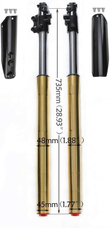 Material: steel Suspension Length: 73.66cm (29) Fork Diameter: 48mm (1.89) Center Pole Diameter: 22mm Bolt Distance: 160mm Design: Triple Tree Clamp with inverted suspension fork motorcycle design Compatibility: Fits most 110cc to 125cc Pit Bikes and Motor Bikes such as Tianzhong, TTR, Upgrade your off-road experience with the 29 45/48mm Triple Tree Clamp Front Forks Shock, designed for 110cc to 125cc Pit Bikes and Motor Bikes.Constructed from steel, these front forks provide and improved performance, delivering a smoother and more stable ride across various terrains.The inverted suspension fork design enhances shock absorption, reducing the impact from bumps and uneven surfaces, which supports better handling during aggressive riding. Disclaimer: This is an aftermarket spare part.Trademarks are used only to specify compatible devices.