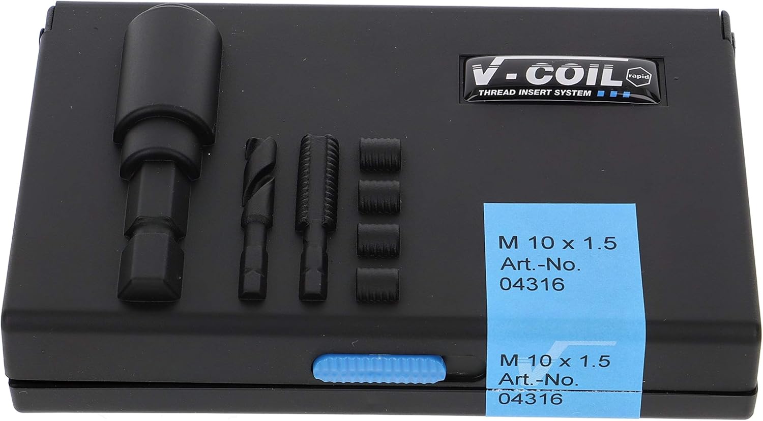 Thread Repair of damaged or worn-out threads. Thread Armour Plating for material with low shear strength. Recovery of rejected items, for new highly stable and long-lasting internal threads, perfect for maintenance, installation and small series production. Wire Thread Inserts DIN 8140, tolerance ISO 2 (6H), Type S - free running, from stainless steel. Contents: 1x V-COIL rapid STI-Twist Drill, 10.4 mm VÖLKEL 03086, 1x V-COIL rapid STI-Taps, For, HSS-G, 10 x 1.5 VÖLKEL 03096, 1x Tang Break Tools, No. 13 VÖLKEL 07096, 10x Wire thread inserts - type S - free running M 10 x 1.5 – 1.5 D, 1x V-COIL rapid inserting tool, 10 x 1.5 VÖLKEL 08096.