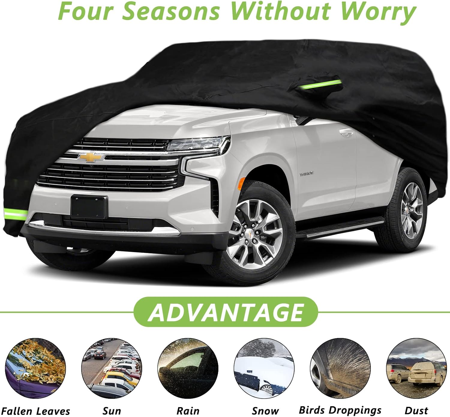 YIXIN for 2007-2022 Chevrolet Tahoe/ GMC Yukon/ Cadillac Escalade Car Cover, Your Mobile Garage, Giving Your All-Weather, All-Season Protection Feature: STURDY MATERIAL: Durable Material Made of high quality and heavy weave Polyester Taffeta Cloth, durable, no faded, UV resistant and 100% waterproof. The polyester taffeta material will be thinner, the waterproof effect is extremely strong, and the storage is convenient Driver Single door zipper for easy access, Front Reflective Stripes for avoiding scratched at night. Technical Details Brand :YIXIN Package :Storage bag Cover Dimension: For 2007-2022 Chevrolet Tahoe/ GMC Yukon/ Cadillac Escalade Car Cover :Up to 213” L Fit Vehicles for 2007-2022 Chevrolet Tahoe/ GMC Yukon/ Cadillac Escalade Car Cover Package Included: 1 X Cover 1 X Windproof buckle rope 1 X Storage Bag Why Choose YIXIN Car Cover Most people need a car cover because their cars are parked outdoor and suffered from rain, UV rays, snow, dust, dirt, and bird droppings. No worries, what we do is to protect your car from all of this. Our car covers give your vehicle all-round protection. This cover is superior to competitors' in many features. The 100% Waterproof to prevent rain into your car and protect your car from frozing in winter. Aluminum is good at Sunproof and UV Coating anti UV rays.