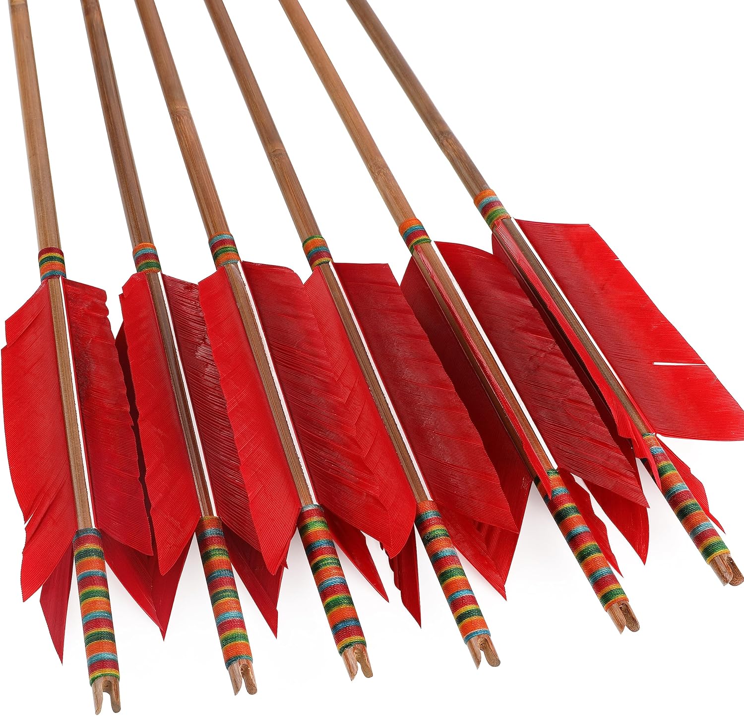 Specifications: Item Name: Archery Bamboo Flu-Flu Arrows Material: High Mountain Tea Stem Bamboo Full arrow length: 33.4 inch/85cm Arrow shaft length: 32.8inch/83.5cm Arrow feather: 4 pieces turkey feathers 4 Inch Arrow Feather Color: red, yellow, green, purple, blue, white Shaft diameter: 8mm Weight: about 35-40g, due to the characteristics of the material of the bamboo arrow shaft, there will be an error in the weight. Suitable for: Hunting Recurve Bow Traditional Bow Longbow Horsebow Package includes: 6/12 bamboo flu-flu arrows NOTICE: 1. Arrow point tips: with glued field points tips, this kind arrows be reinforced with 2 points to prevent the arrowhead from falling off due to the seasonal changes (heat expansion and contraction). 2. Arrow feathers: 4 pieces turkey feathers. Arrow feathers are natural original feathers, so the length will be a little difference. The feathers may be squeezed during transportation, which will cause the feathers to deform. Steam produced by boiling water can be used to make feathers recover the original shape quickly. 3. The largest draw weight it can bear is 50lbs, it means that your bow's draw weight couldn't over 50lbs when you shooting these arrows.